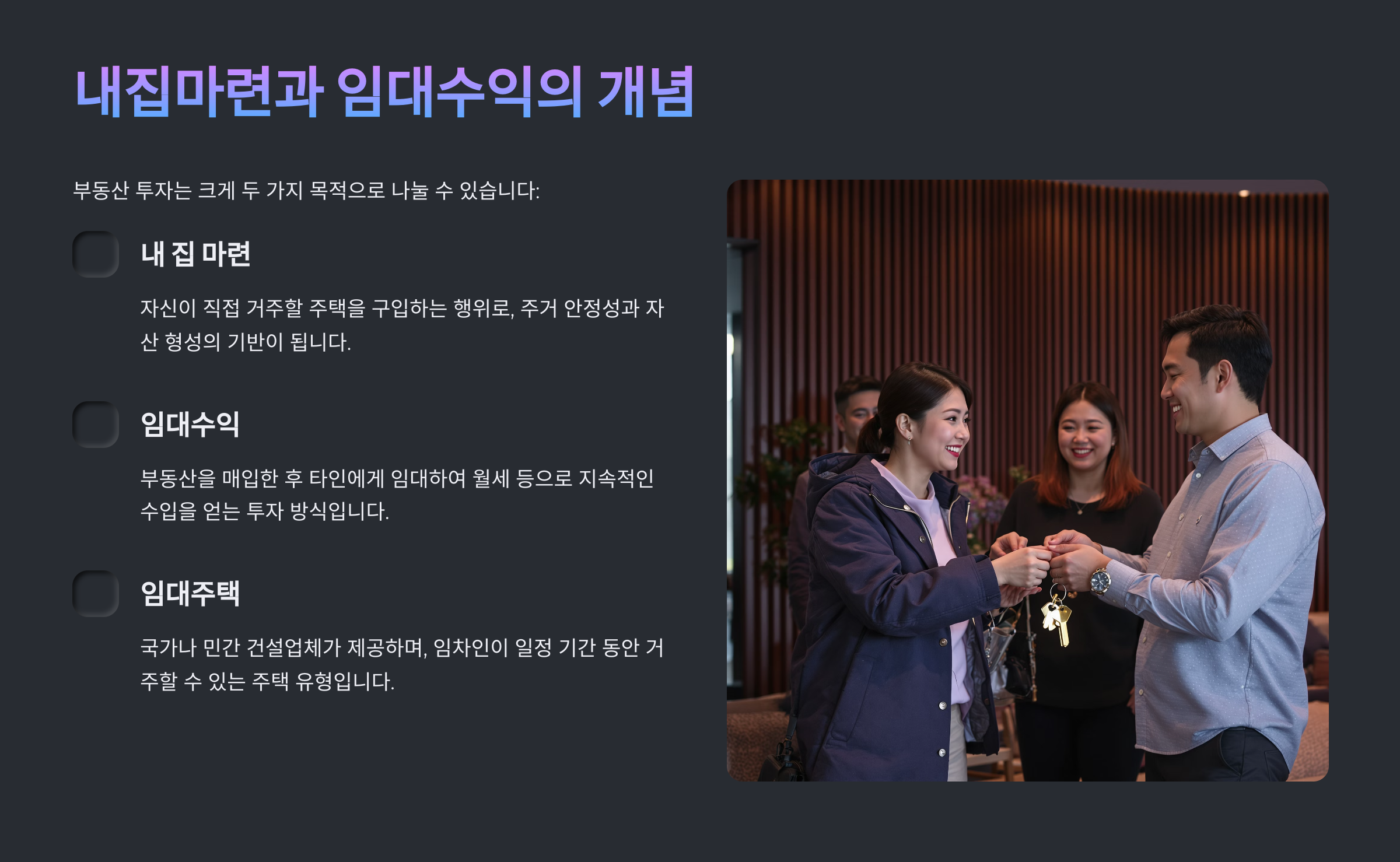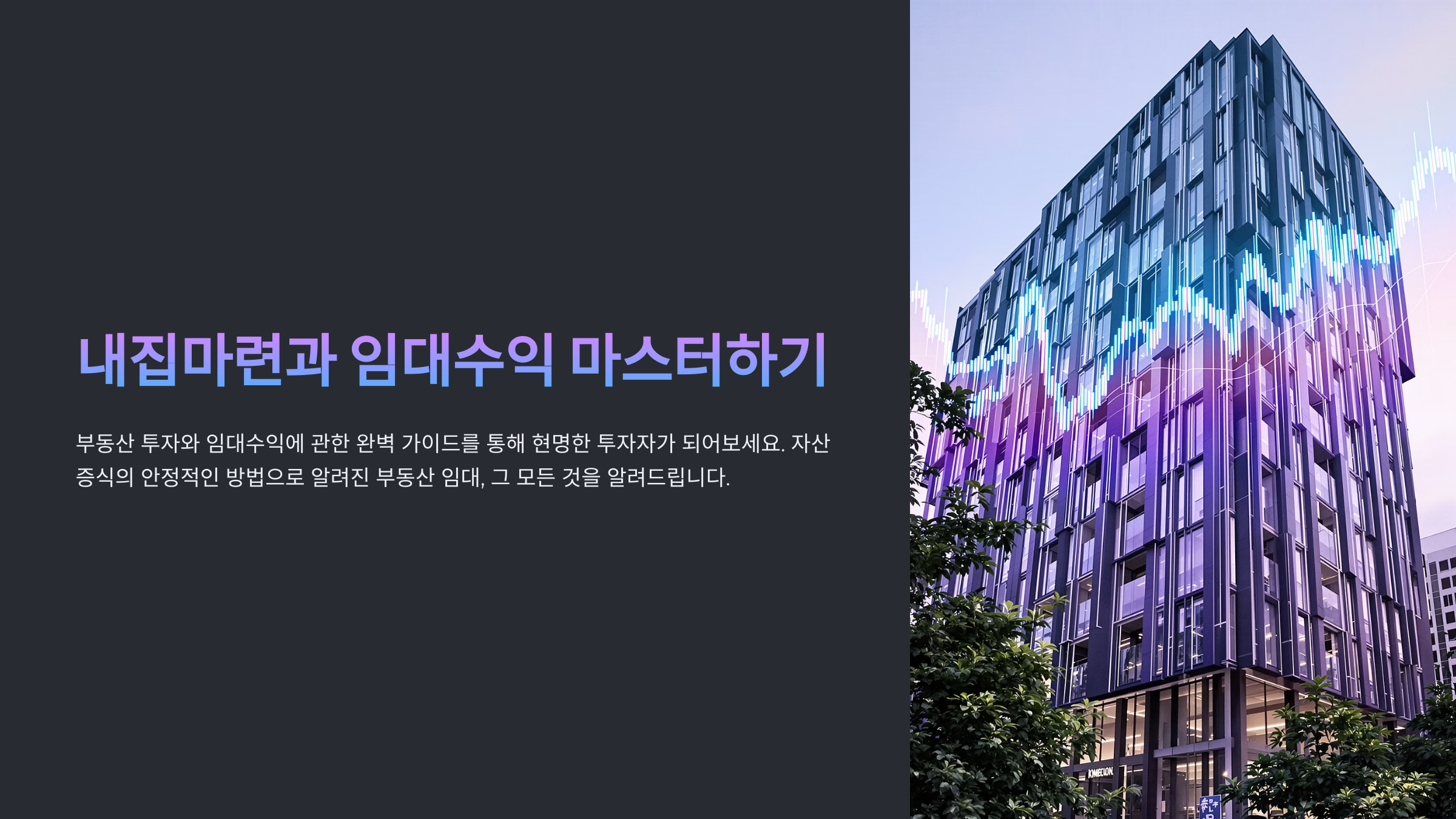 예를 들어, 아파트나 오피스텔을 분양받은 후 직접 살지 않고 세입자에게 임대해 월세나 전세 수익을 얻는 경우죠. 이때 중요한 건 단순한 임대가 아니라 ‘수익률’ 개념이에요.