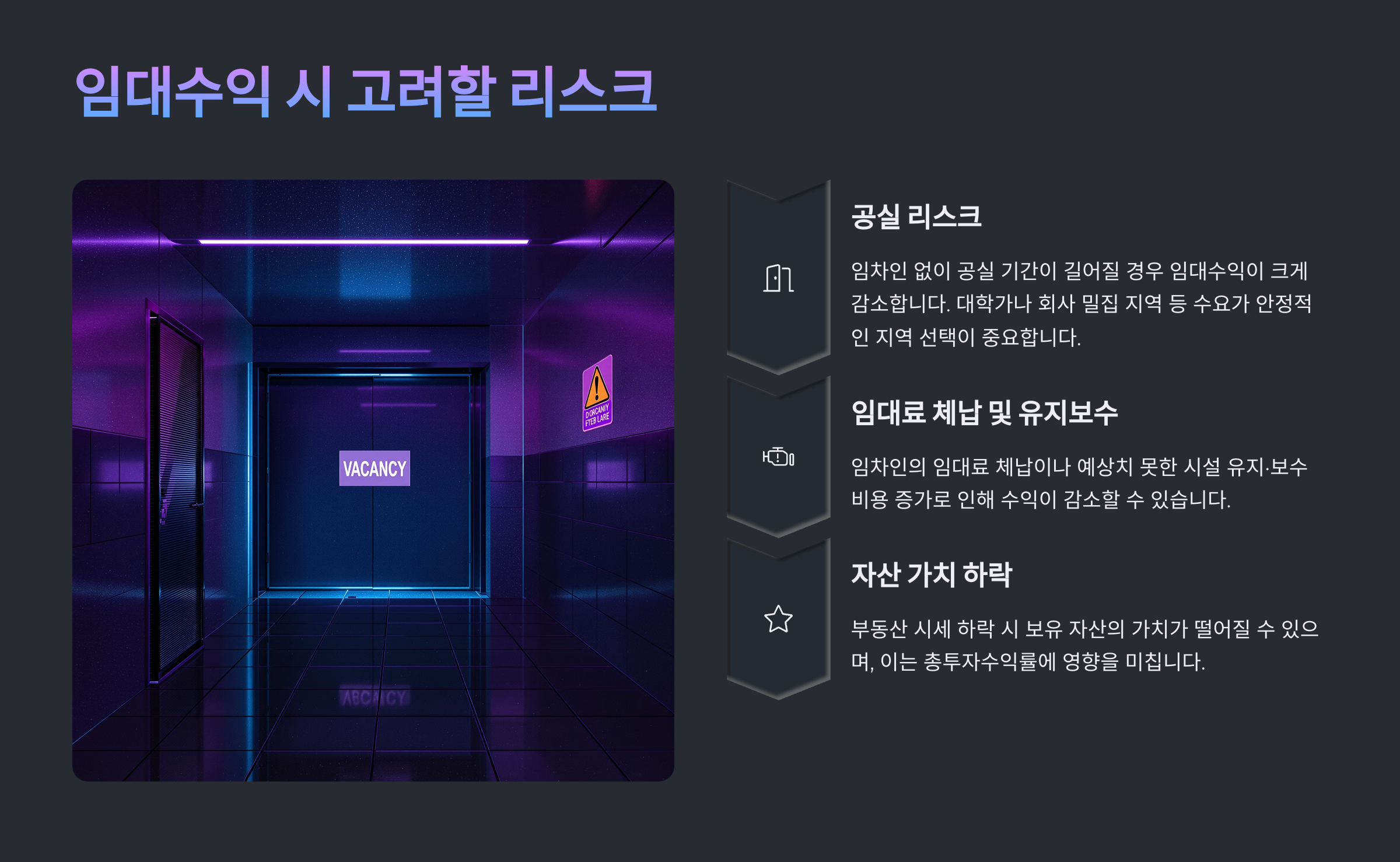 | 공실 | 수익률 급락 | 임차인 관리, 시세 분석 |