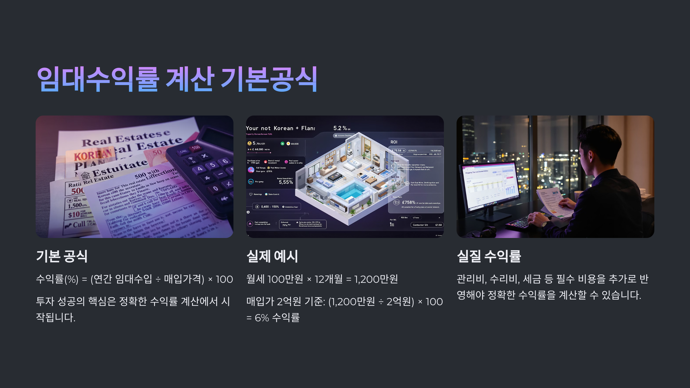 임대수익률을 계산하는 가장 기초적인 공식은 아주 간단해요. 바로 연간 임대수입을 매입가로 나누는 방식이에요. 이걸 백분율로 나타내면 수익률이 되는 거죠.