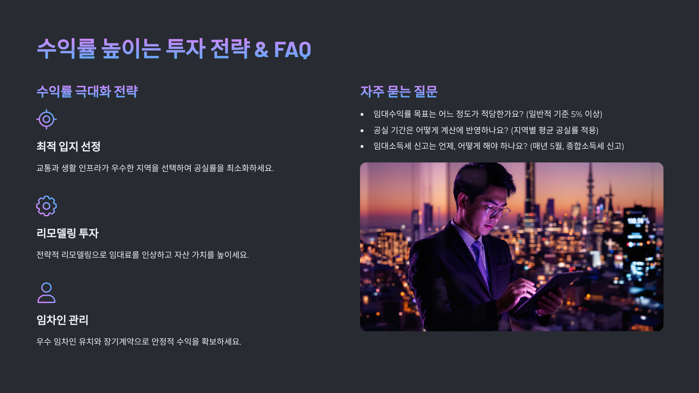 임대수익률을 높이기 위한 전략은 단순히 "싸게 사서 비싸게 임대한다"로 끝나지 않아요. 시장 분석, 입지 선정, 리모델링, 임차인 관리까지 전반적인 전략이 필요하답니다.