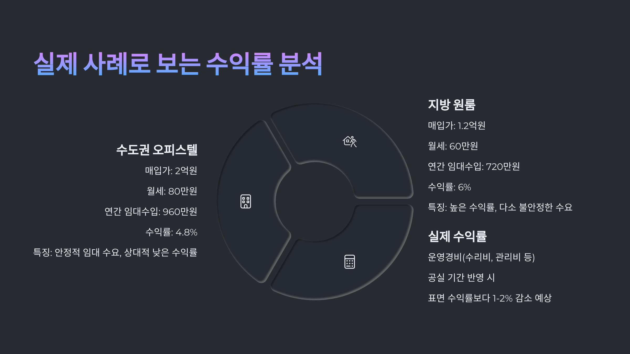 실제 임대수익률을 살펴보면 단순한 이론 계산보다 현실적인 변수들이 많이 작용해요. 수도권과 지방, 아파트와 오피스텔, 대출 여부 등 다양한 요소들이 수익률에 큰 영향을 준답니다.