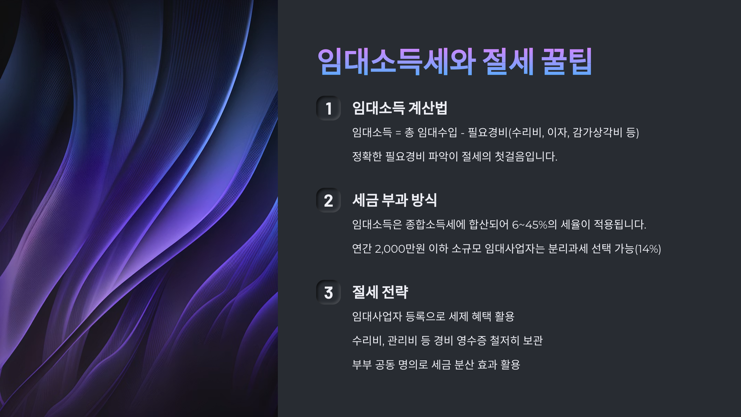 하지만 이런 구조에서도 절세 팁은 분명히 존재해요. 예를 들어 공동명의로 주택을 소유하면 소득을 분산시켜서 세부담을 줄일 수 있고, 필요경비 공제를 적극 활용하면 과세표준을 낮출 수 있어요.