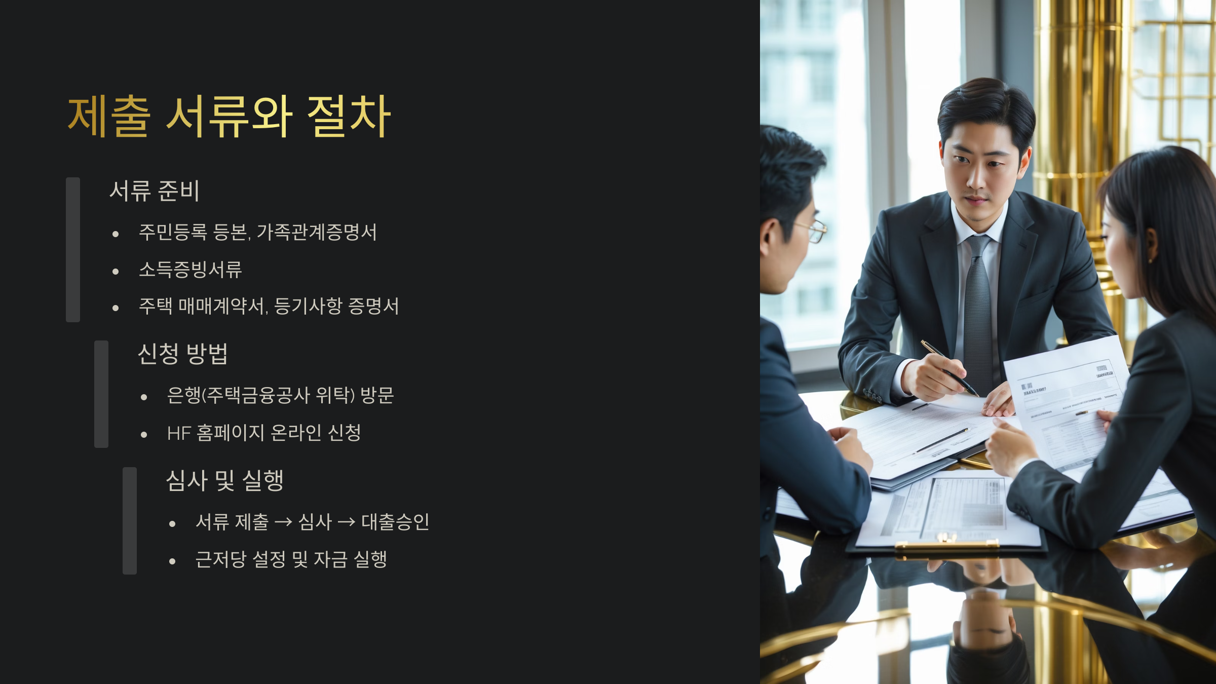 신청 절차는 주택금융공사 홈페이지나 은행 창구에서 진행해요. 온라인으로 서류를 업로드하거나, 창구에 직접 방문해 접수할 수 있답니다. 접수가 완료되면 심사를 거쳐 대출 승인 여부가 결정돼요.