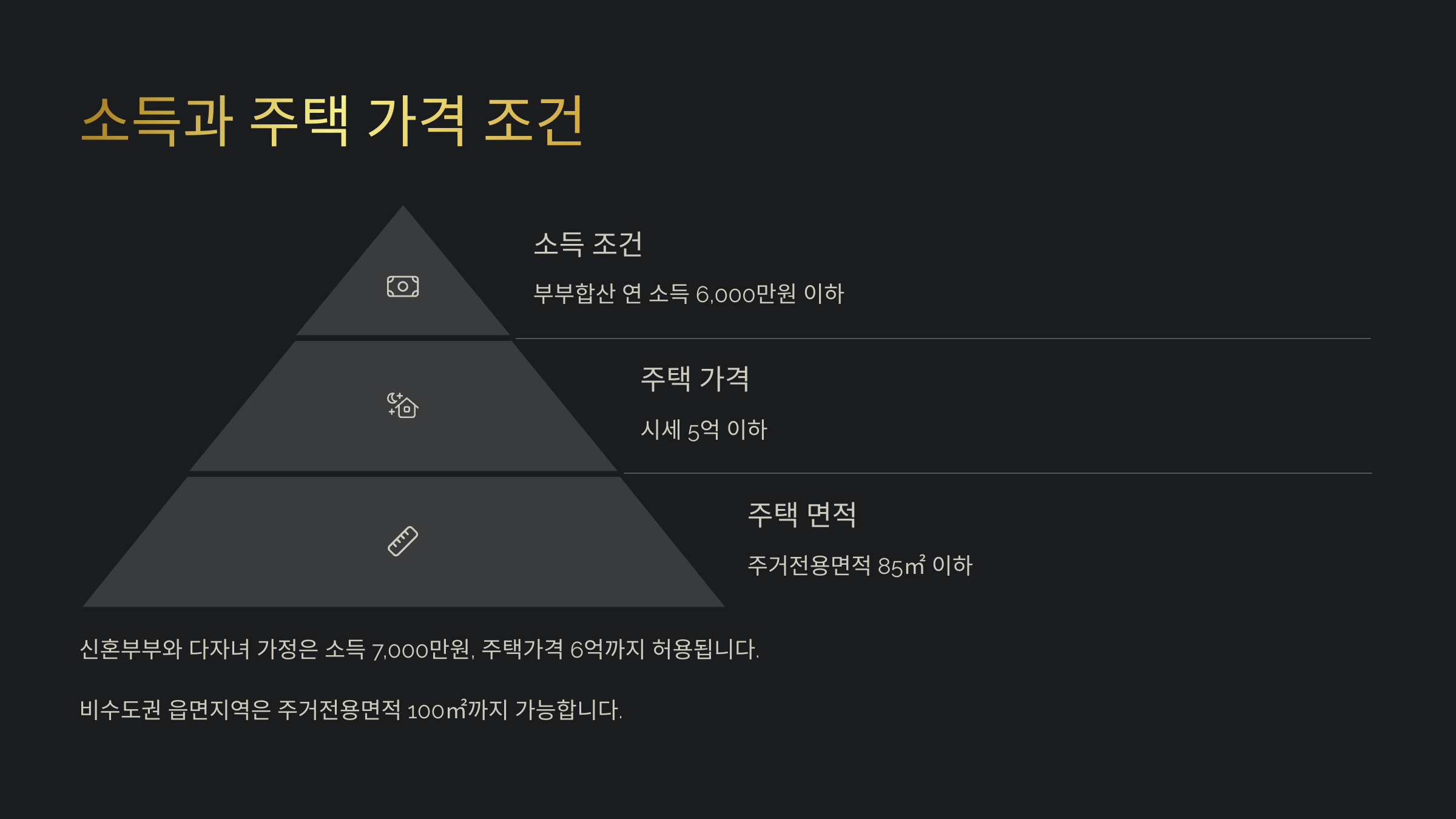 | 연소득 | 부부합산 7천만 원 이하 (신혼부부 등은 8천5백만 원 이하) |