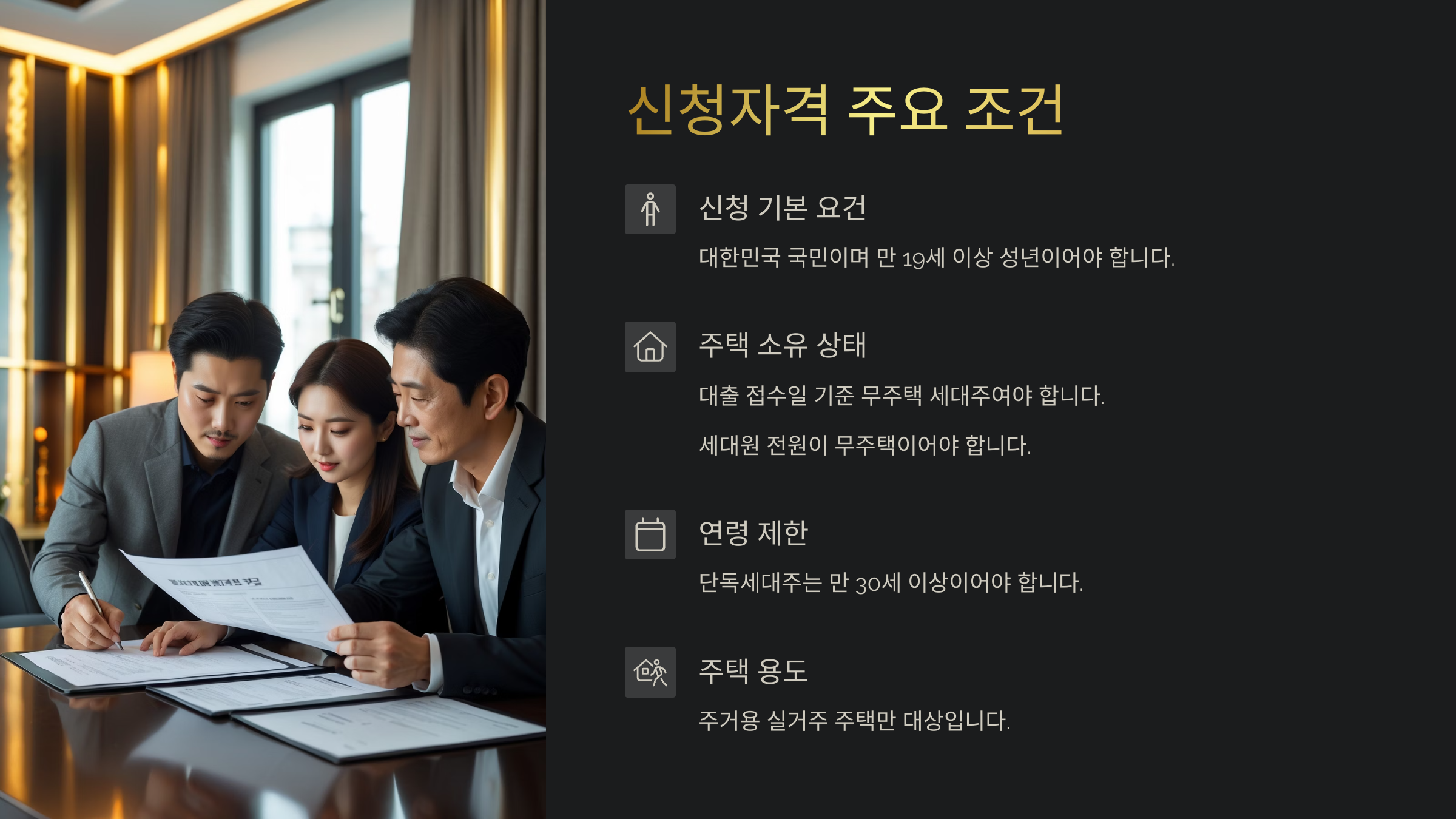 또한 대출 신청일 기준으로 대출자와 배우자의 주택 보유 여부가 중요해요. 본인뿐 아니라 배우자, 세대 구성원의 주택 소유 여부도 함께 검토돼요. 그래서 사전에 가족 구성원들의 상황을 꼼꼼히 확인하는 게 좋아요.