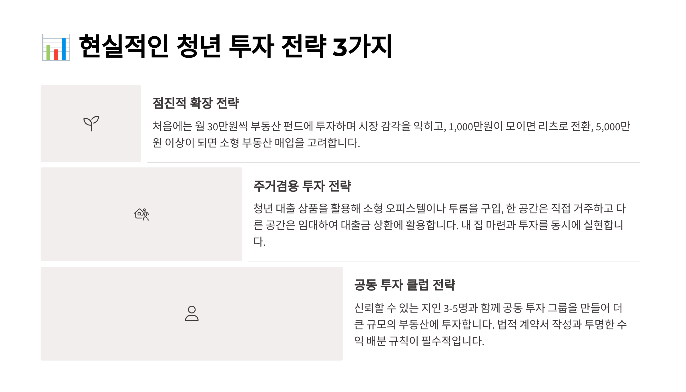 이런 방식은 단기 수익보다는 장기적인 자산 운용에 적합해요. 부동산이라는 안정적인 자산군에 장기적으로 투자해 포트폴리오를 만들고 싶은 청년들에게 딱이에요. 📈