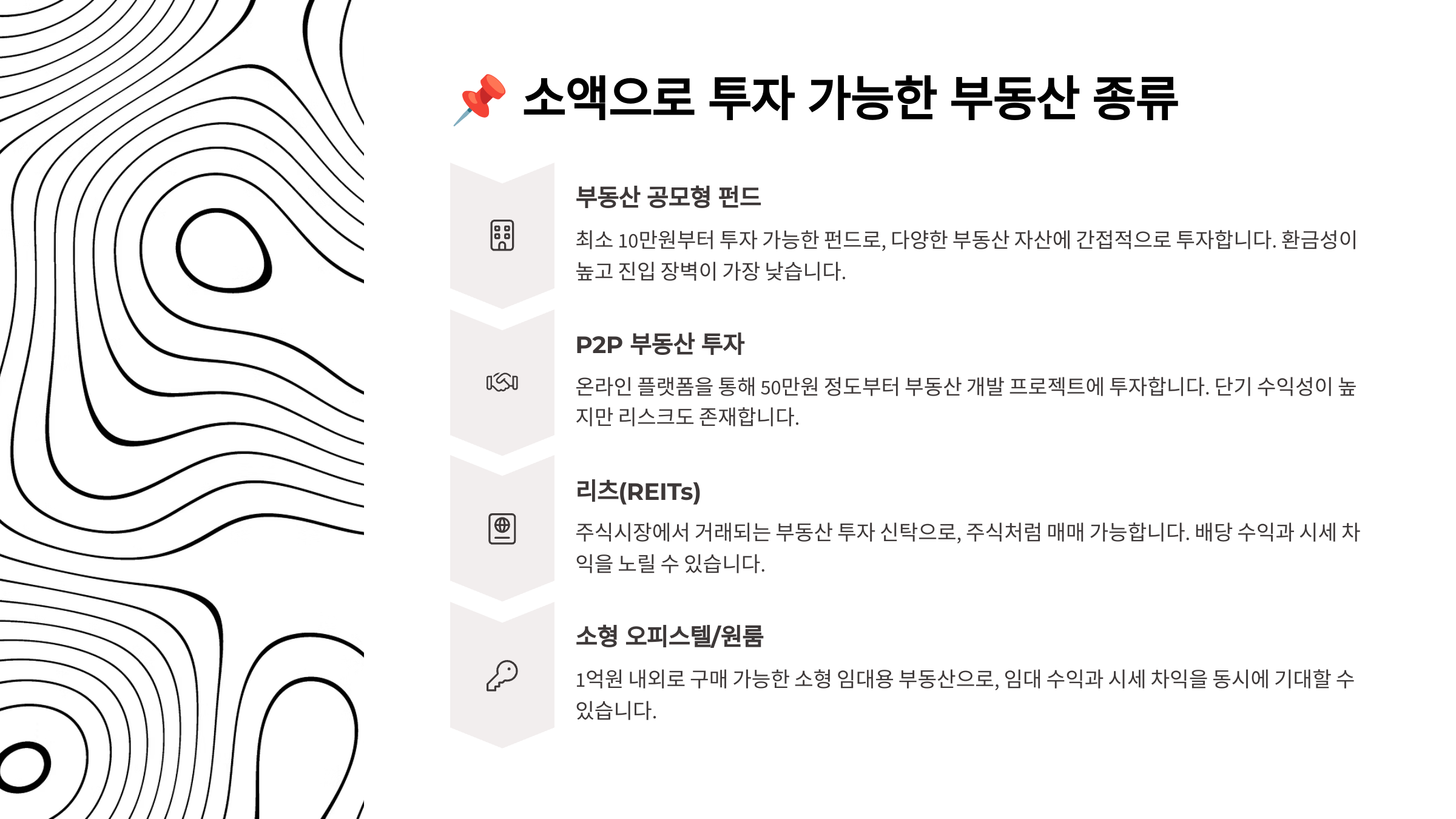 소액 부동산 투자는 말 그대로 큰 자금 없이, 적은 금액으로 부동산 자산에 접근할 수 있는 다양한 방법을 말해요. 과거에는 부동산 투자가 '억대 자산가들'만의 전유물처럼 여겨졌지만, 이제는 10만 원, 50만 원 단위로도 가능하답니다.