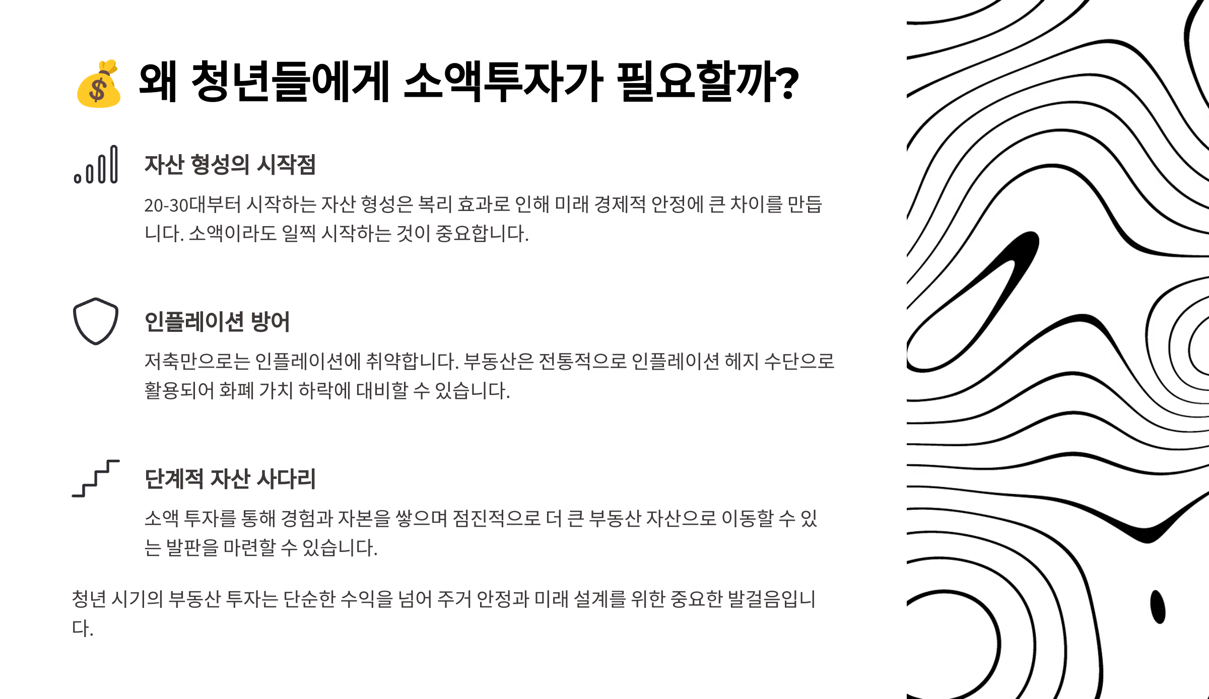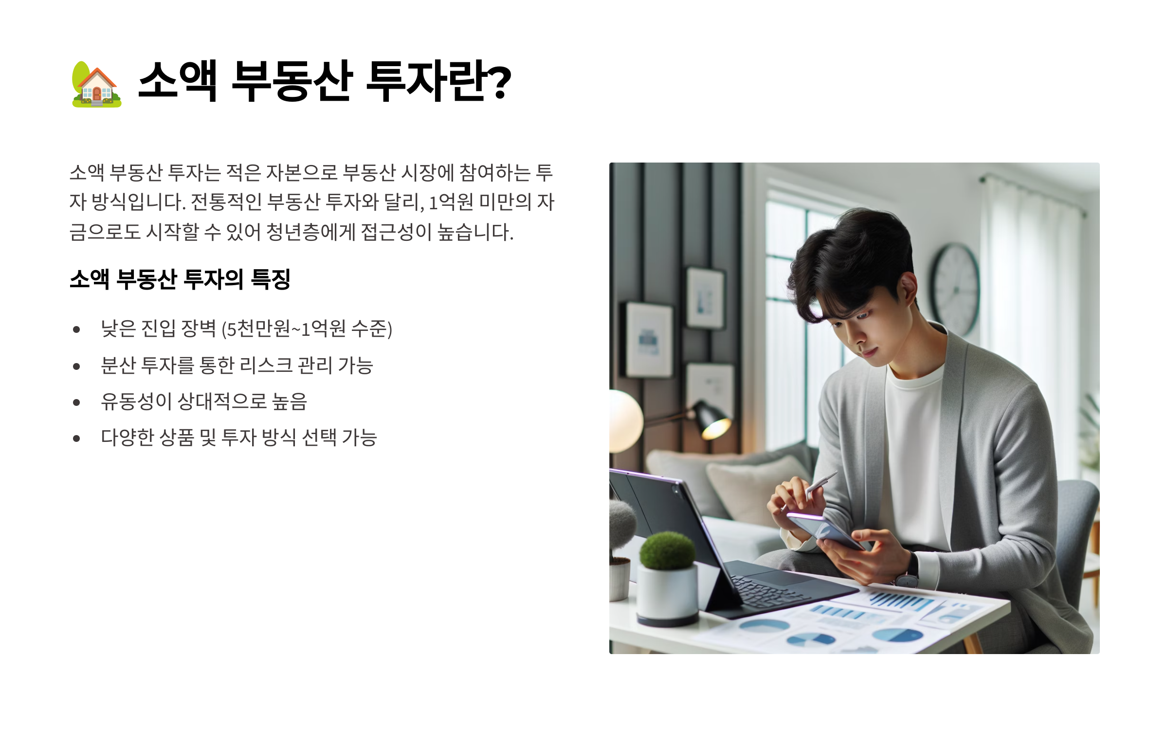 특히 사회 초년생들은 목돈이 없어 주식에만 의존하거나, 소비 지출이 늘어 저축도 어려운 상황이에요. 이럴 때 '5만 원, 10만 원'이라는 소액으로 부동산에 접근할 수 있다는 건 굉장히 유의미한 기회예요.