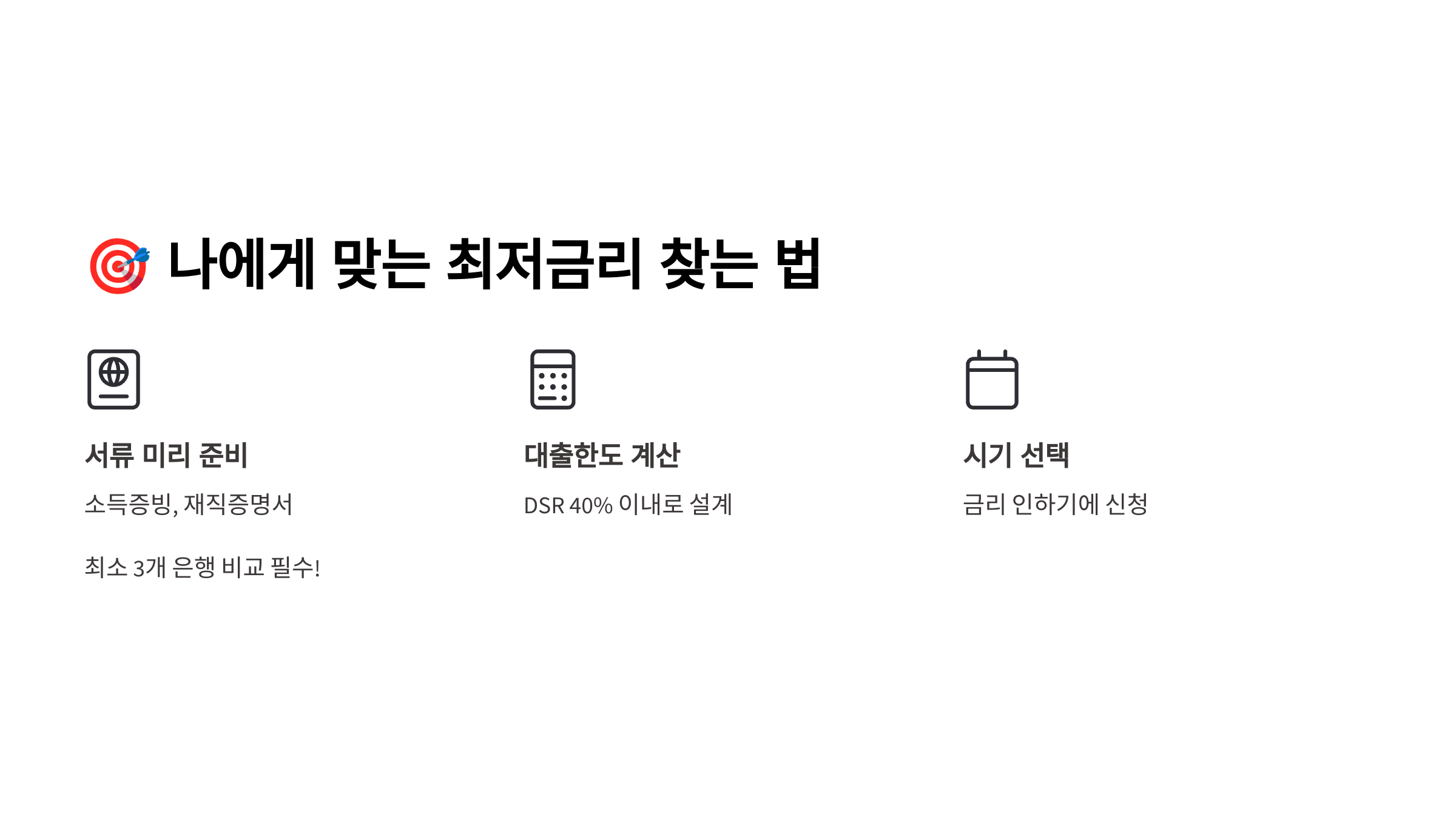 결국 금리를 낮추는 핵심은 ‘내 조건 파악 → 금융기관 비교 → 우대금리 적극 활용 → 지속적 관리’ 이 네 단계를 꾸준히 체크하는 거예요. 📈