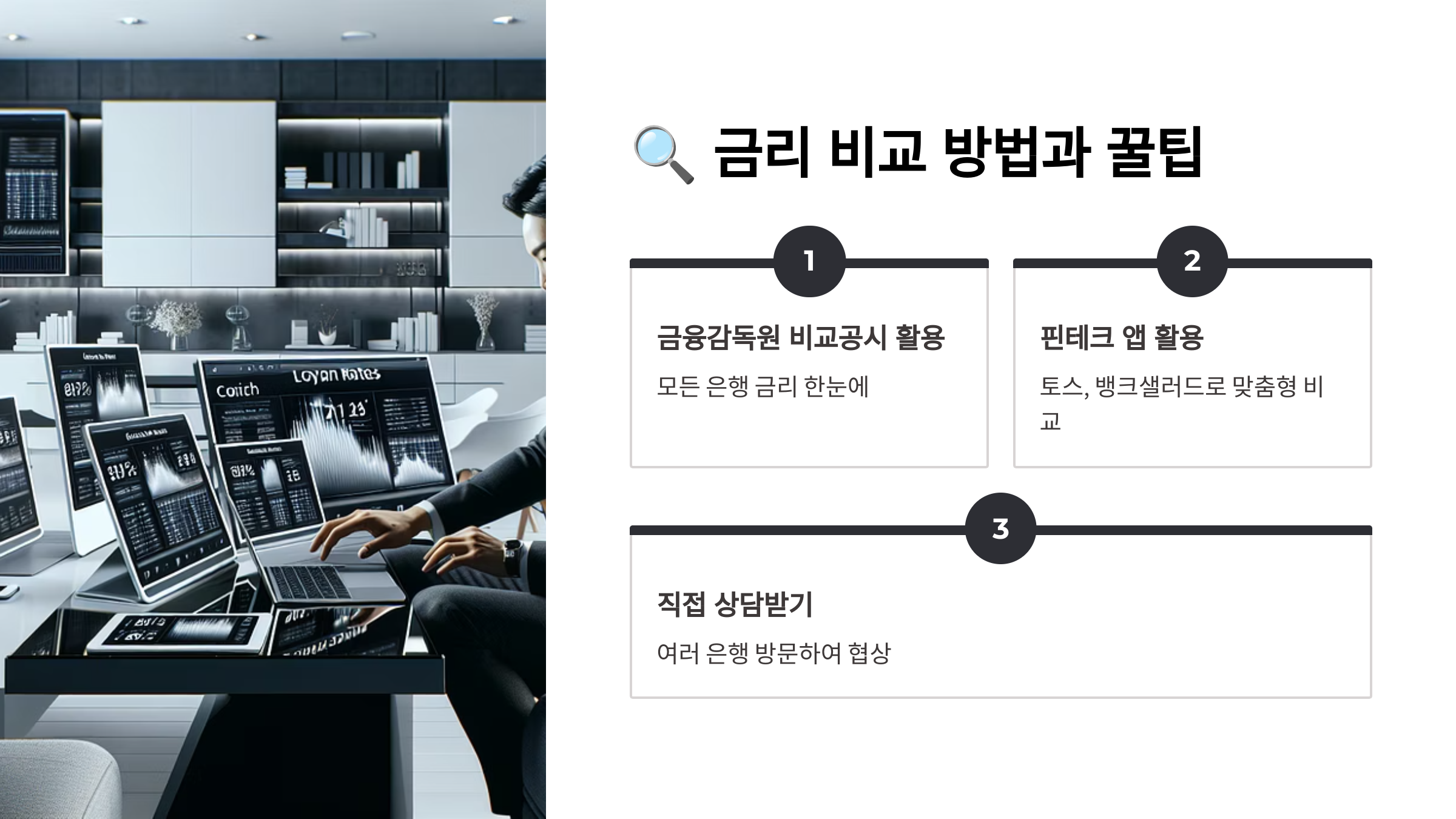 가장 먼저 해야 할 일은 **대출금리 비교 사이트 활용하기**예요. 금융감독원 ‘금융상품 한눈에’, 은행연합회, 신용조회사에서 제공하는 대출비교 서비스를 적극 활용하면 간편하게 조건을 볼 수 있어요.