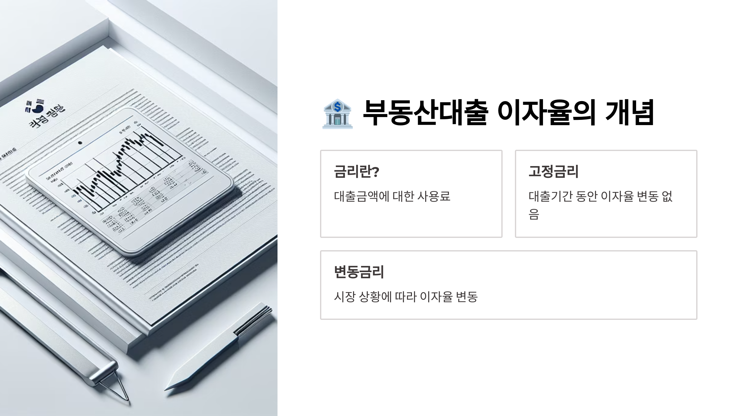 부동산대출 이자율은 금융기관에서 돈을 빌릴 때 적용되는 이자의 비율이에요. 일반적으로 연이율 기준으로 표시되며, 대출의 형태나 기간, 고객의 신용등급 등에 따라 달라지죠.