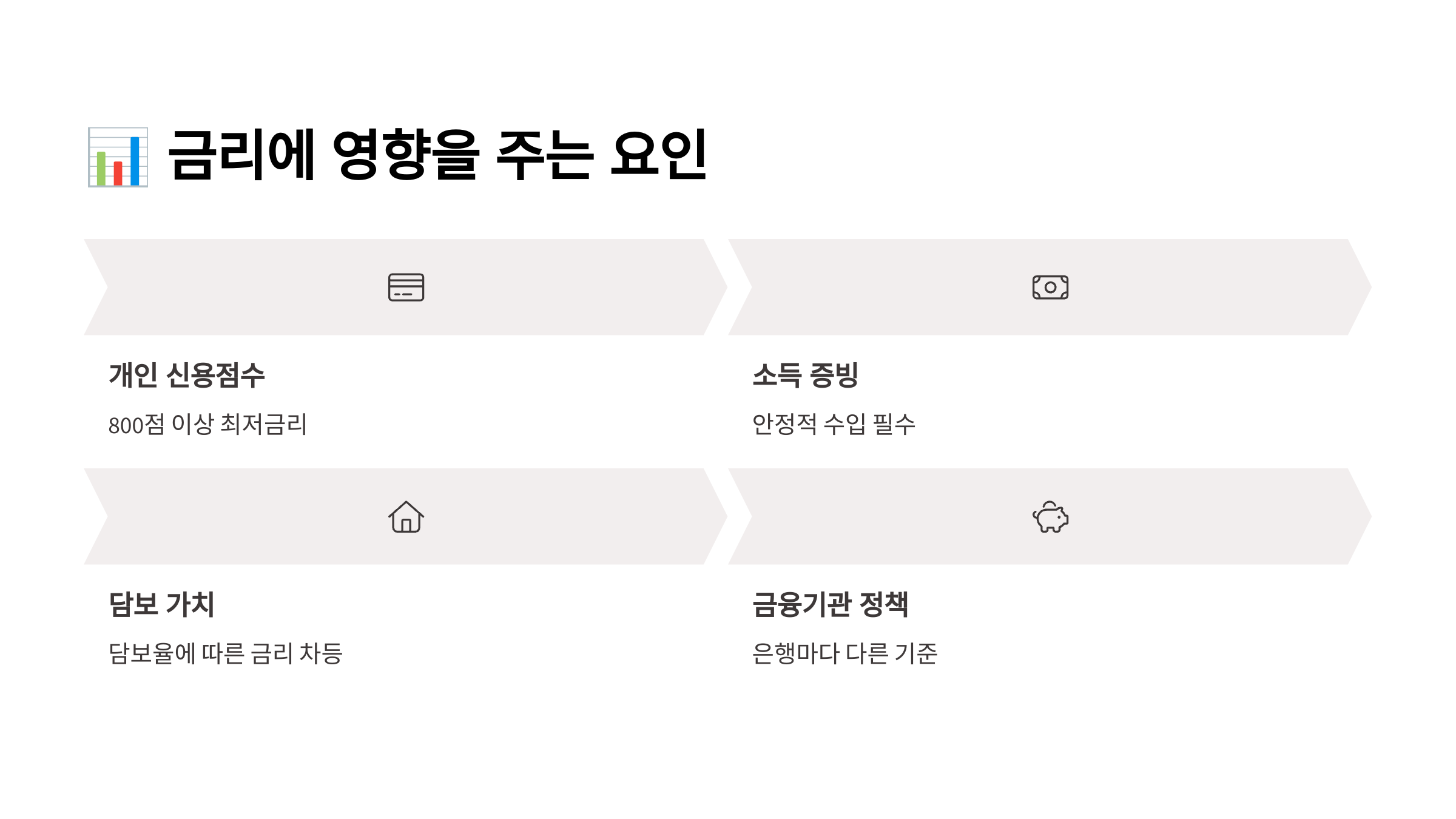 | 신용등급 | 높을수록 우대금리 가능, 낮을수록 고금리 적용 |
