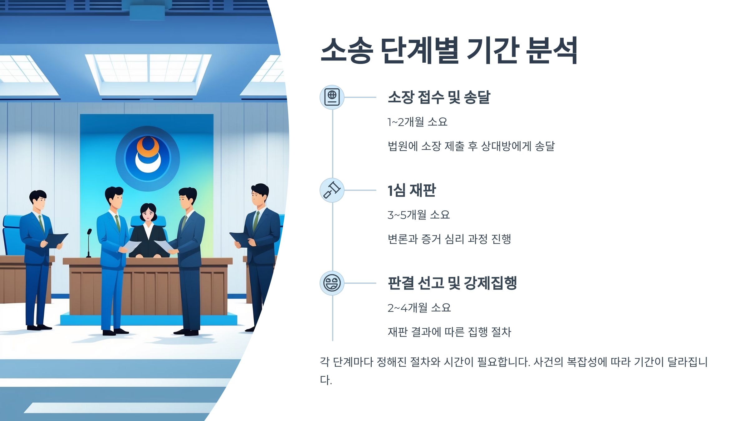 변론기일이 모두 끝나면 재판부의 판결 선고가 내려지는데, 보통 1~2개월 정도 걸려요. 이렇게 1심 소송만으로도 평균적으로 6개월~1년 정도는 소요되는 경우가 흔하답니다. 📅