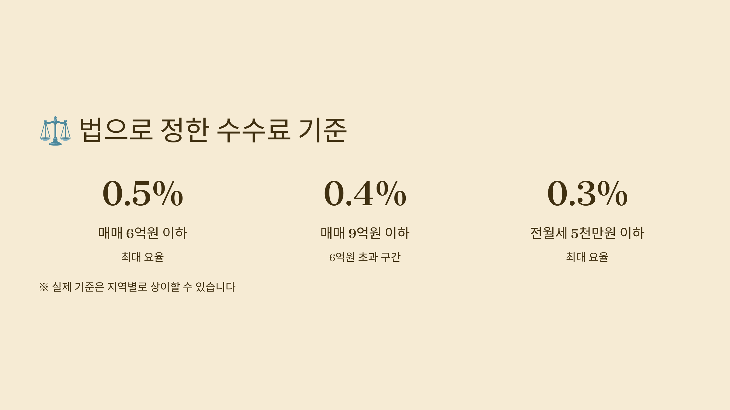 대한민국의 부동산 중개수수료는 「공인중개사법 시행규칙」 제20조 및 별표 1에 의해 기준이 명확히 정해져 있어요. 중개업자가 받는 수수료는 거래 금액과 유형에 따라 상한선이 정해져 있답니다.