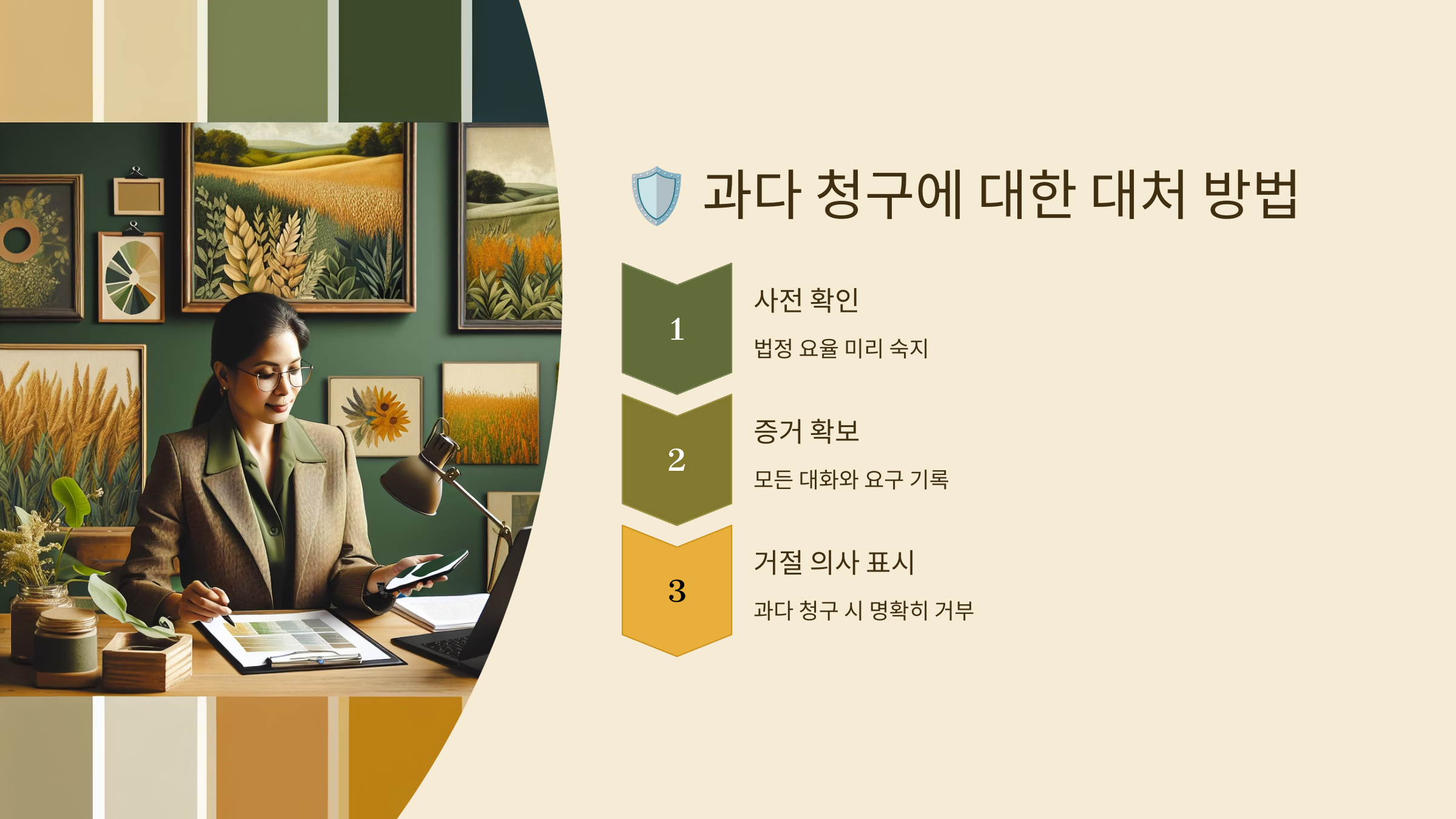 두 번째는 계약 전 중개사에게 정확한 수수료 금액을 미리 확인하고, 설명을 요구하세요. 대화를 녹음해두면 향후 분쟁 시 증거로 유리하게 작용할 수 있어요.