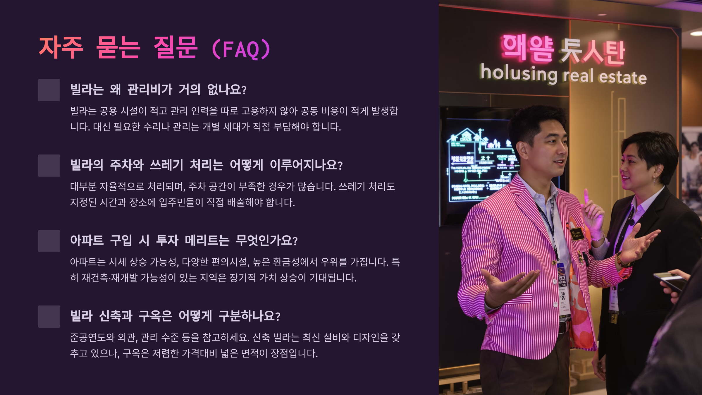 A3. 관리비는 낮지만 직접 처리해야 할 일이 많아서 오히려 번거로울 수 있어요. 생활 스타일에 따라 달라요.