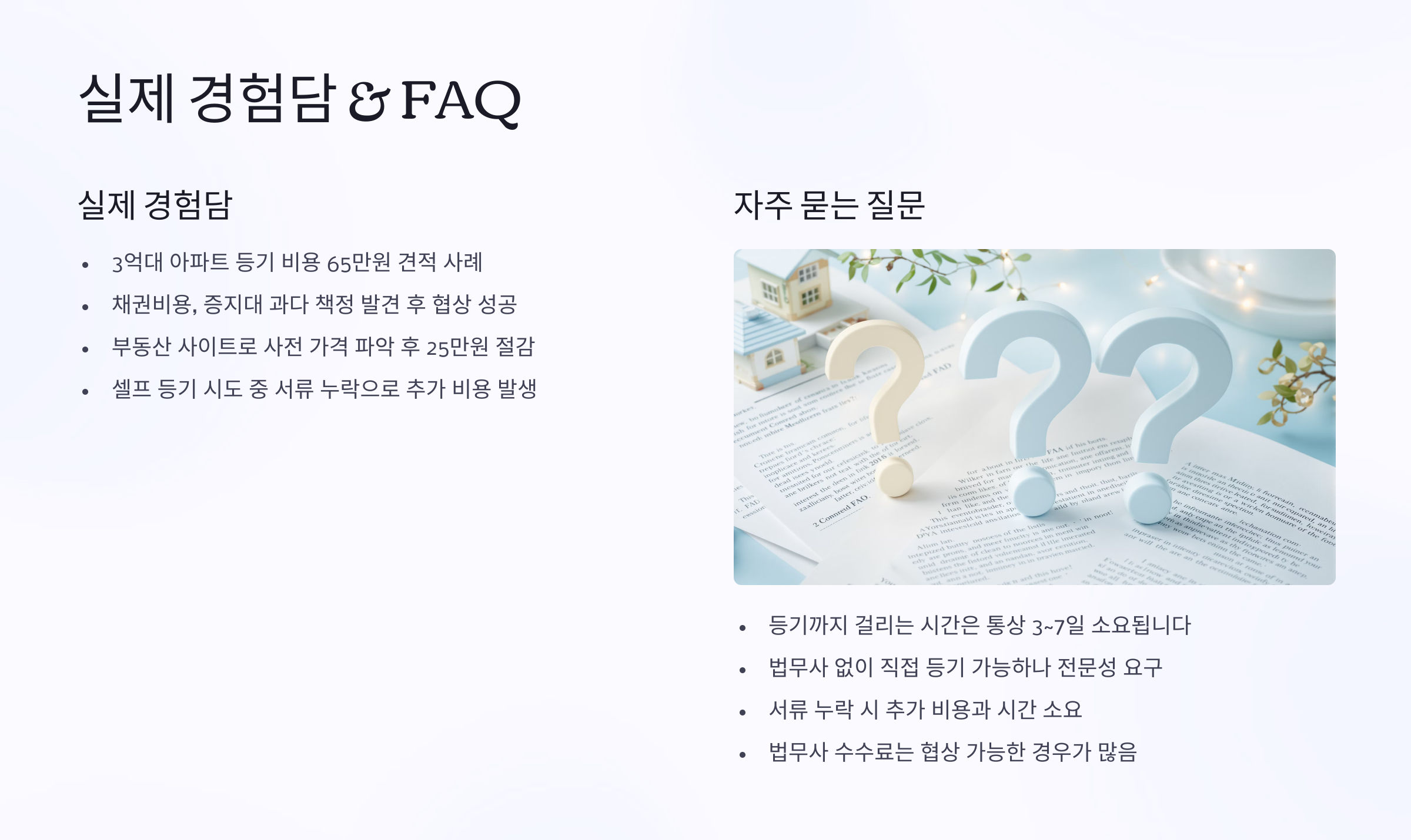 이 외에도 등기 과정에서 대출 은행이 실수로 이름을 오기입해 등기가 반려되는 일도 있었어요. 이 경우에도 본인이 절차를 알고 있었기 때문에 빠르게 대응할 수 있었고, 재등기 비용도 법무사 측에서 부담했다는 후기도 있었답니다.