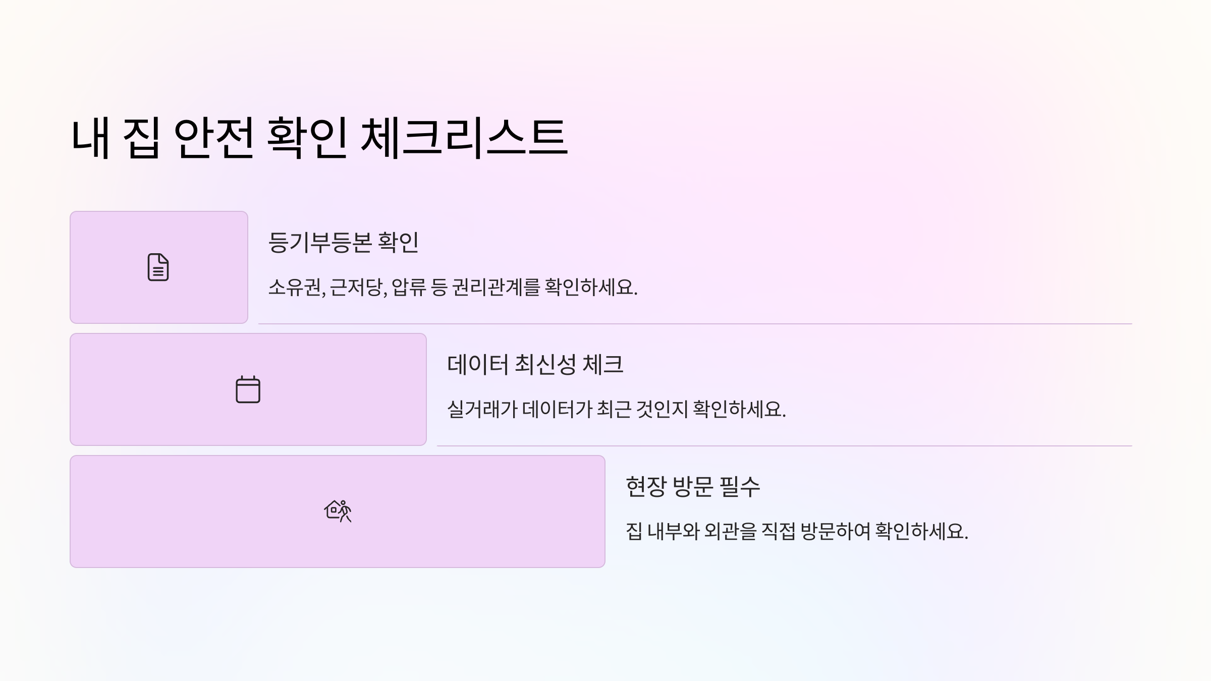 전세사기 예방의 마지막 단계는 '안전 확인'이에요. 단순히 실거래가나 시세만 확인하는 게 아니라, 계약 전 꼭 확인해야 할 몇 가지 항목을 체크리스트로 만들어봤어요. 이걸 다 지켜보면 한층 더 안심할 수 있답니다! 😊