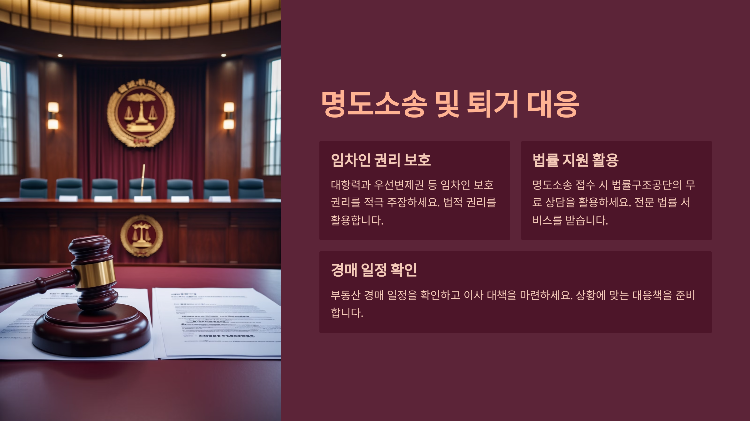 명도소송이 들어왔다면 먼저 법률구조공단 또는 변호사를 통해 '점유이전금지가처분'을 신청하고, 법원에 답변서를 성실히 제출해야 해요. 실제로 많은 세입자들이 퇴거를 거부하면서 보증금 일부라도 돌려받은 사례가 있어요.
