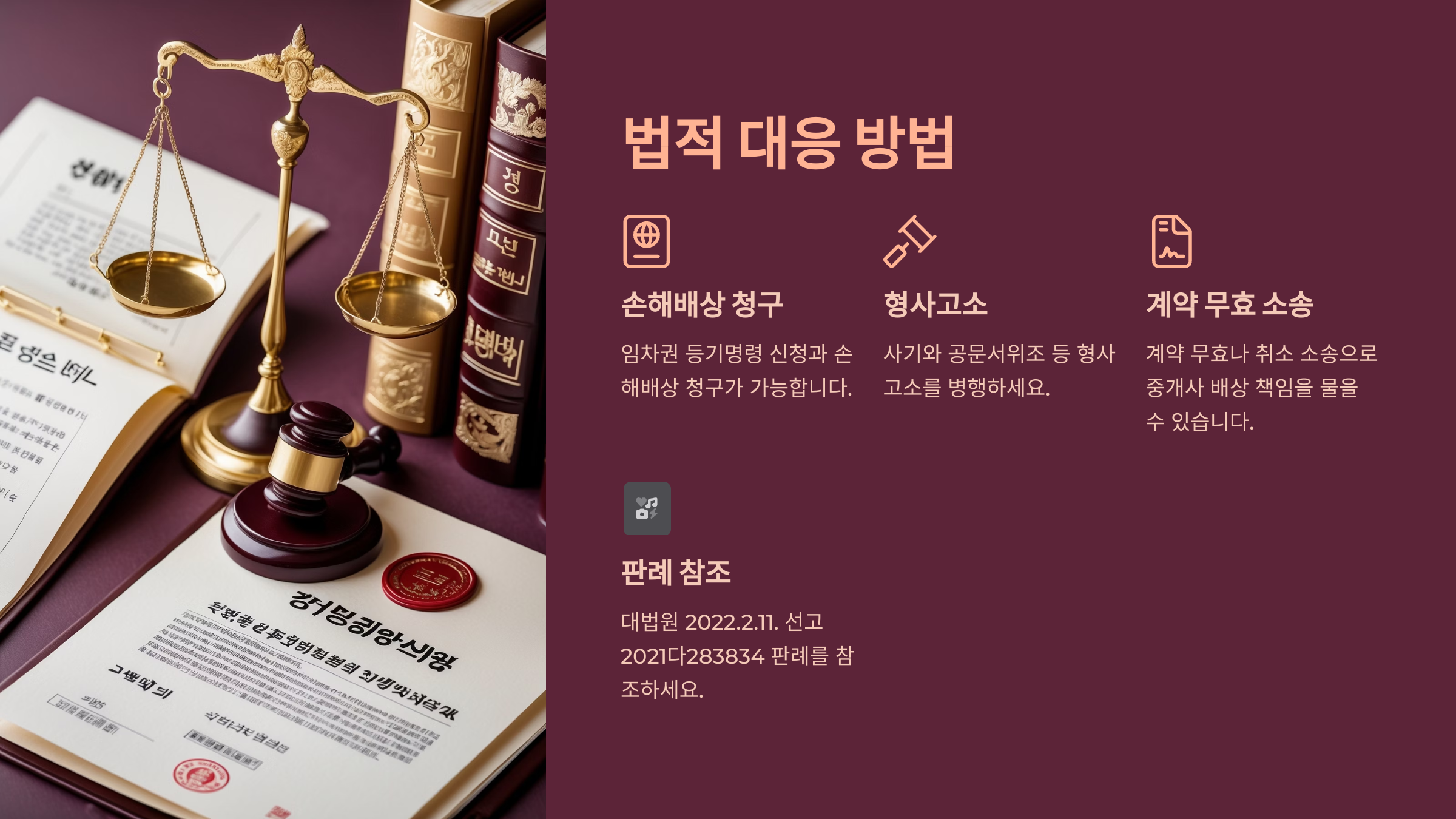 최근에는 소위 '빌라왕', '세모녀 사기단'처럼 여러 명이 조직적으로 허위 매물과 가짜 계약으로 전세보증금을 편취하는 경우도 많기 때문에 신중한 계약이 절대적으로 필요해요.