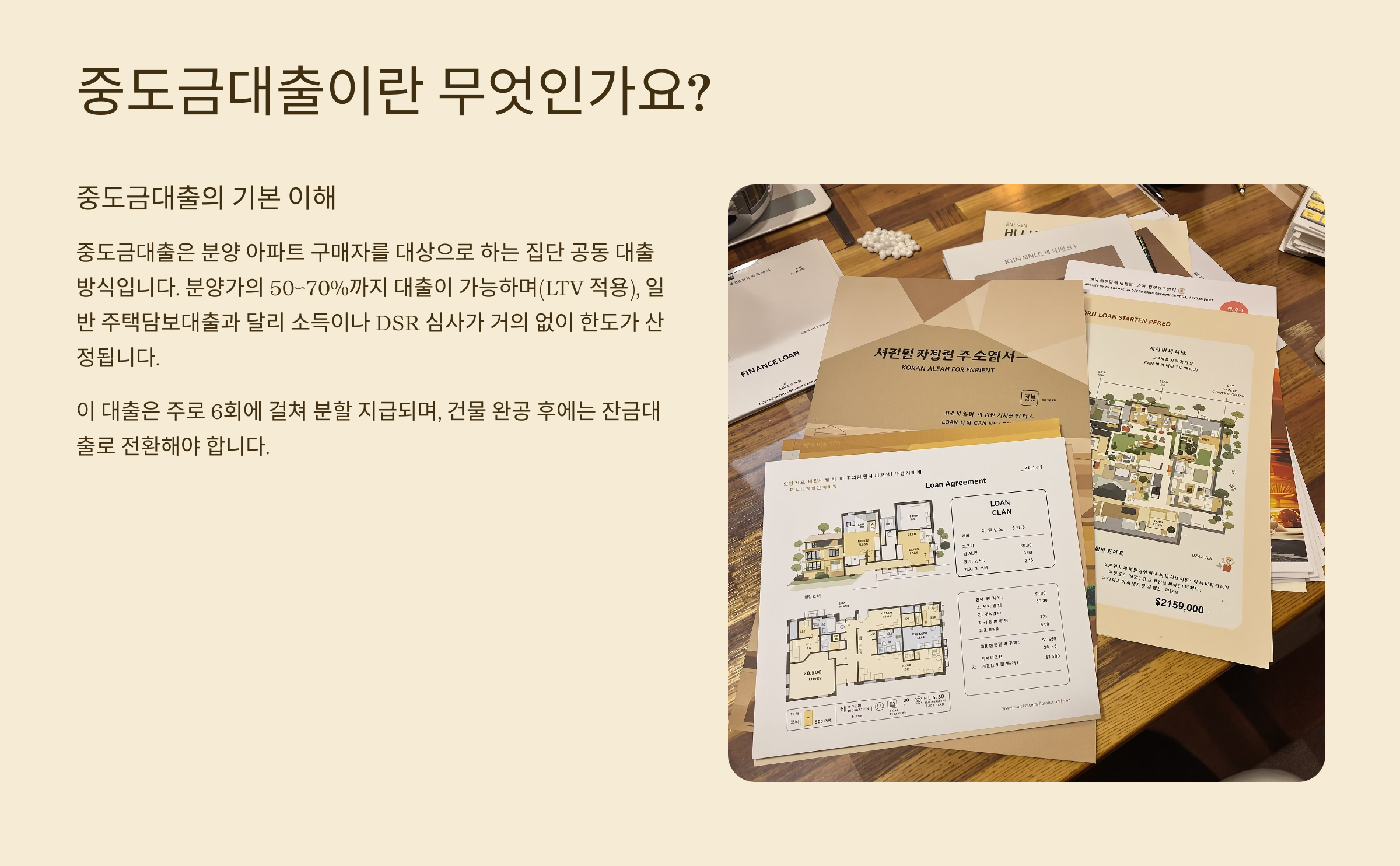 중도금대출은 아파트 입주시점까지 원금상환을 유예하는 경우가 많아서 초기 자금 부담이 적은 편이에요. 따라서 실수요자들이 초기 자금 마련 없이 분양 아파트를 확보하는 데 많이 활용해요.