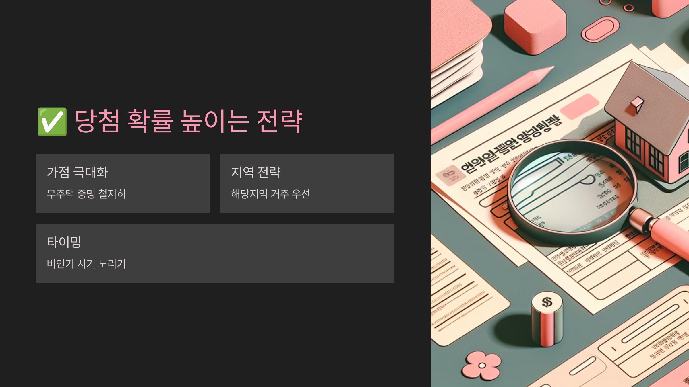 이제는 단순히 청약통장만 가지고 있다고 안심해서는 안 되는 시대예요. 당첨 확률을 높이기 위해서는 체계적인 전략이 필요해요. 생각보다 많은 사람들이 전략 없이 청약을 넣고 있어서 기회를 놓치는 경우가 많답니다. 🧠