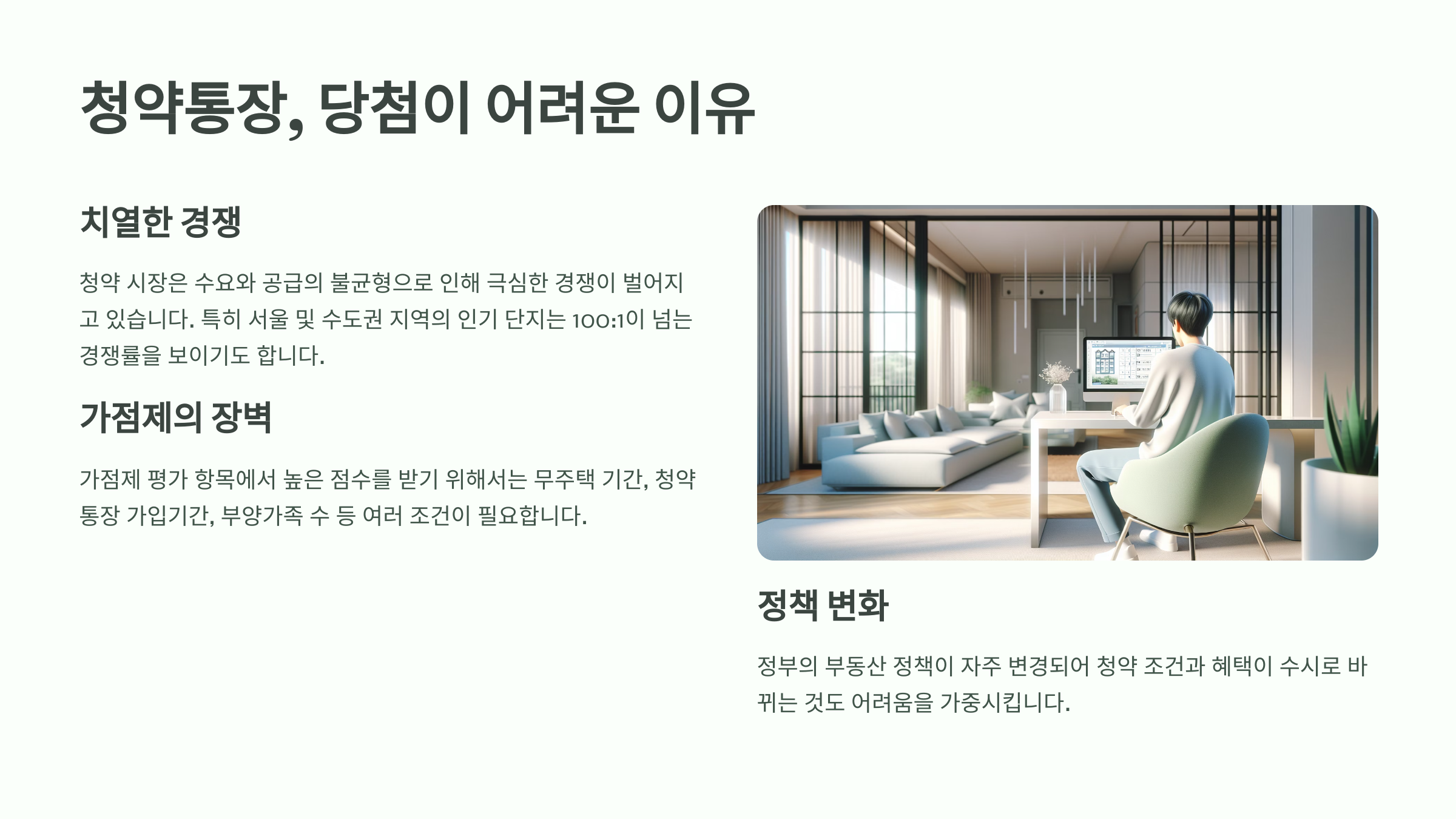 A6. 네, 청약통장을 통해 당첨되면 내 집을 마련할 수 있어요. 하지만 경쟁이 치열하기 때문에 전략적으로 접근해야 해요.