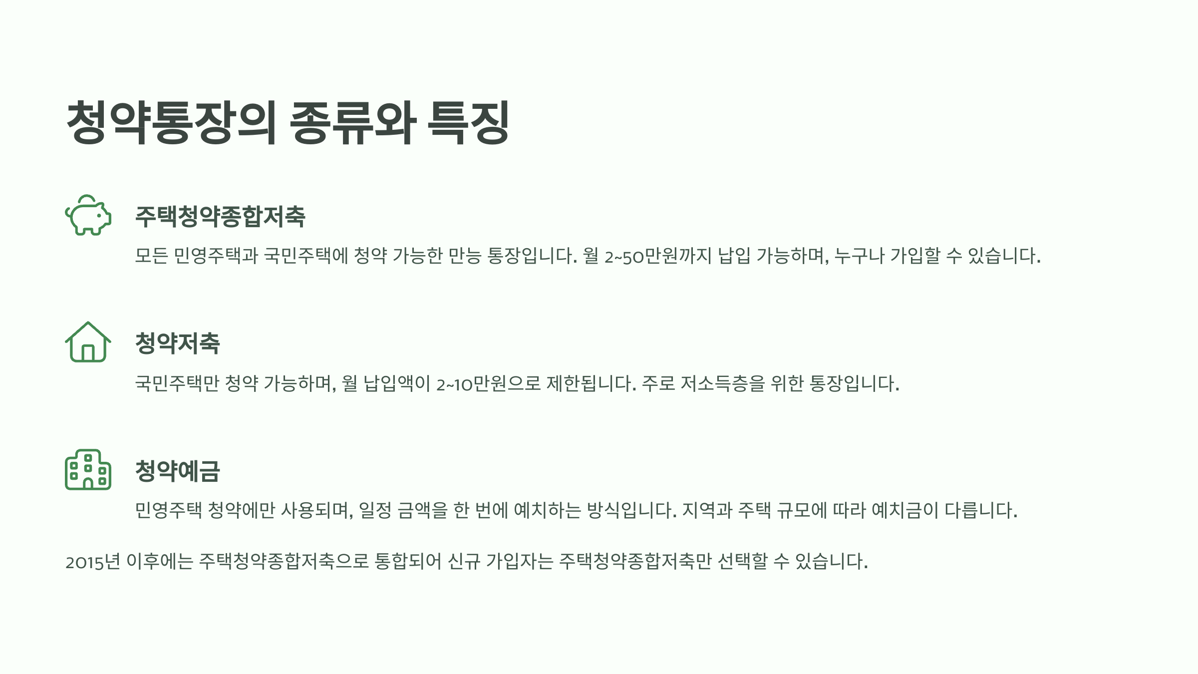 청약통장은 주택청약종합저축, 청약예금, 청약부금 등으로 나눠지며 각각의 특성이 달라요. 가장 많이 사용되는 주택청약종합저축은 아파트 청약에 적합하며, 일정한 납입금액을 충족하면 우선순위를 얻을 수 있어요. 반면, 청약예금과 청약부금은 주택청약종합저축보다 적은 금액으로 시작할 수 있지만, 일정 조건을 만족해야 하기 때문에 전략적으로 활용할 필요가 있어요.
