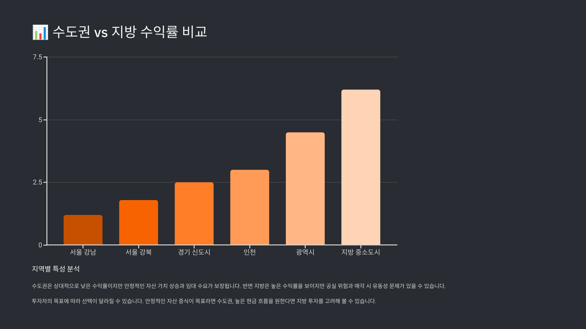 이제 수도권과 지방의 수익률이 얼마나 다른지도 비교해볼까요? 위치가 수익률에 어떤 영향을 미치는지 보면, 투자의 방향이 더 뚜렷해질 거예요. 🧭