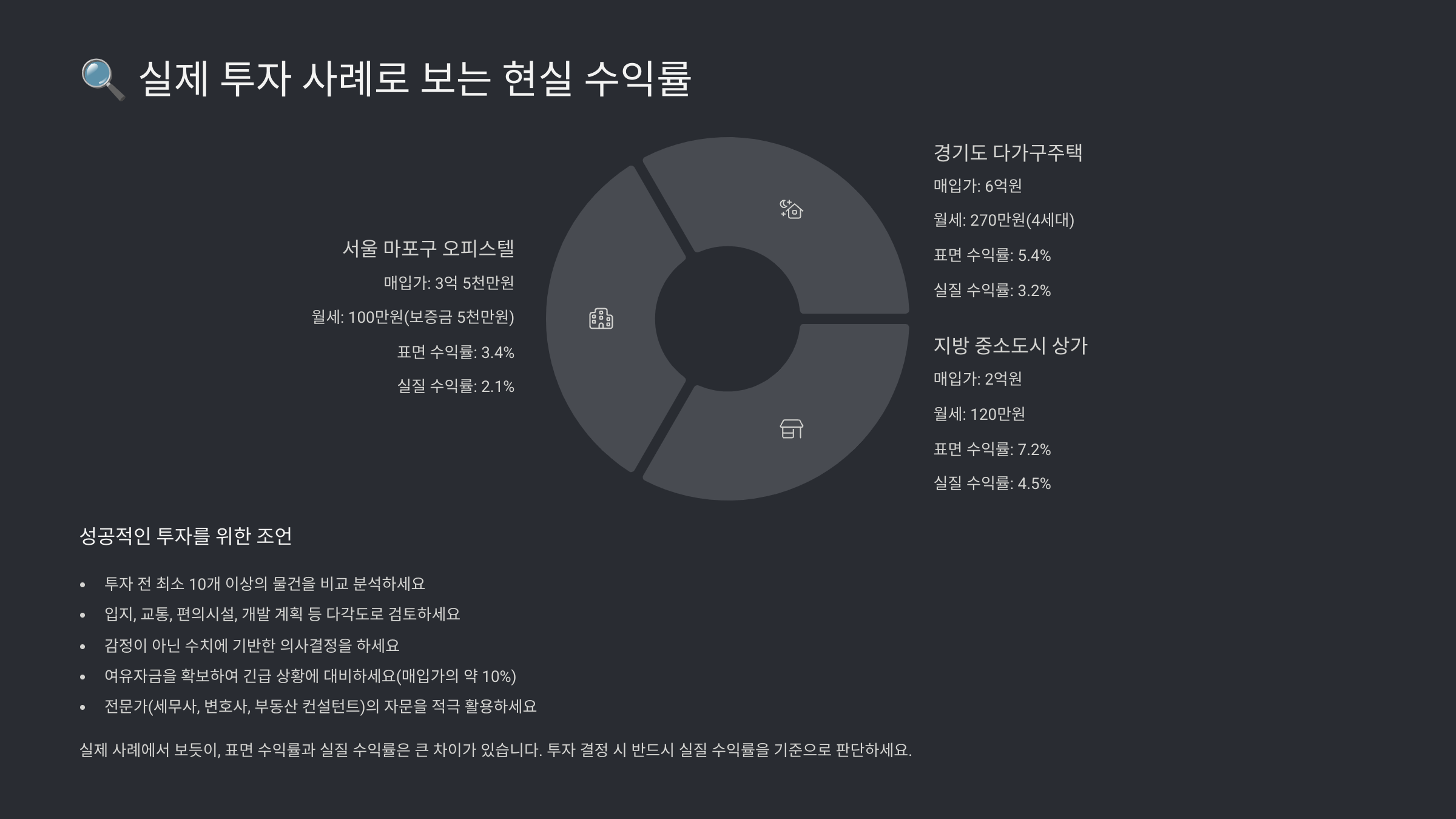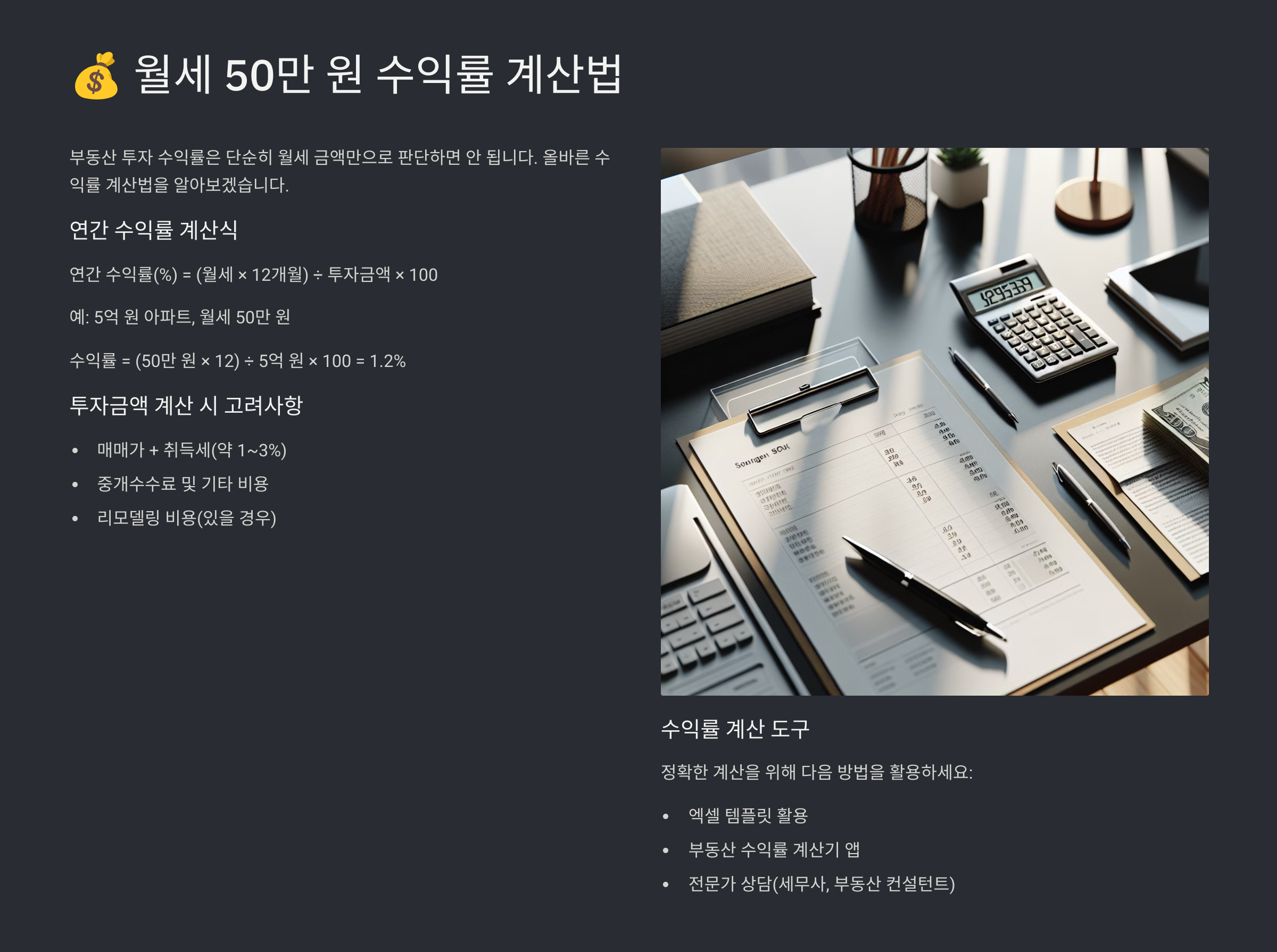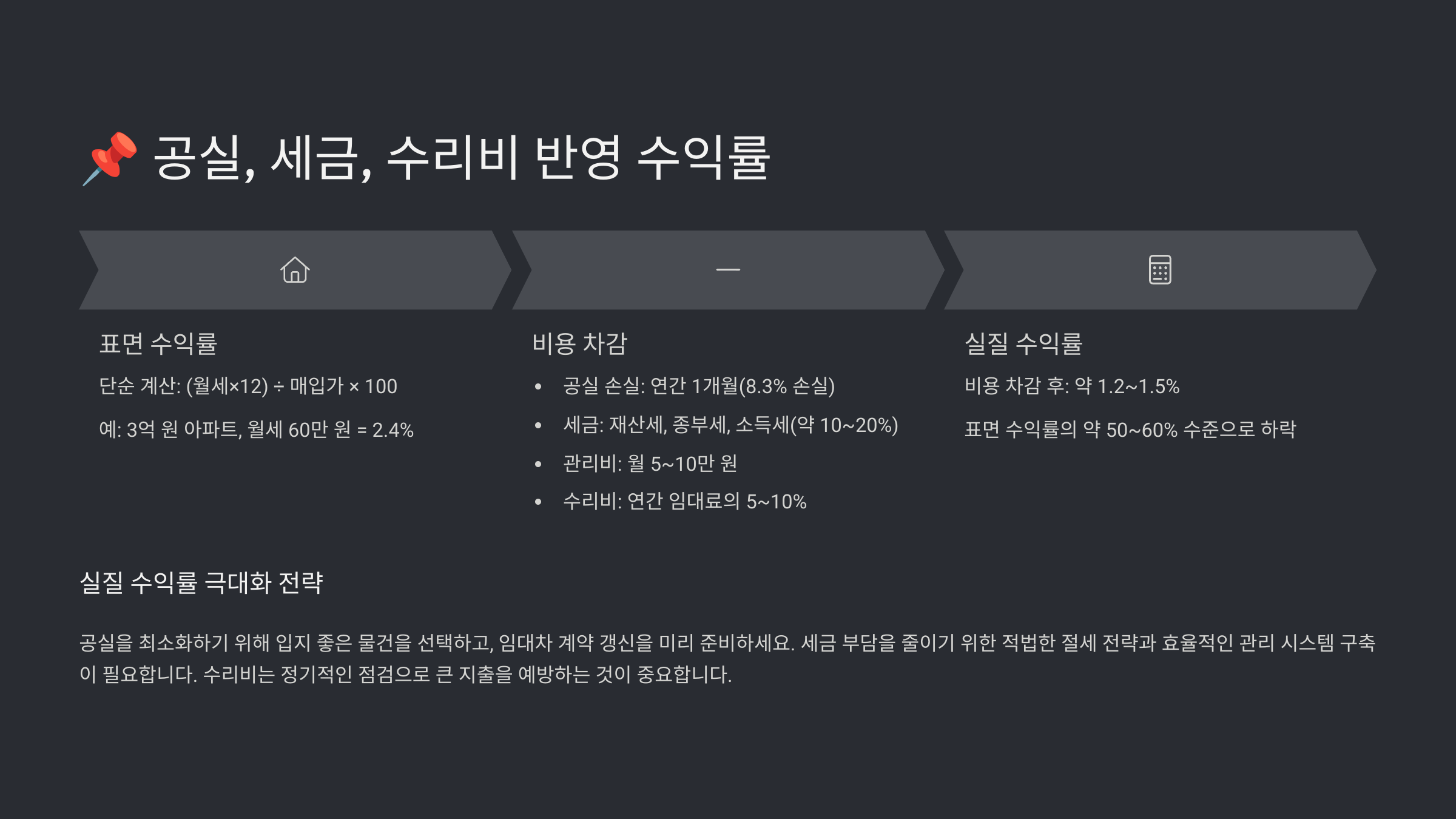 이런 점들을 감안해서 부동산 수익률을 계산하면, 단순히 '월세 50만 원'이 주는 느낌과는 아주 다른 결과를 얻게 돼요. 🧮