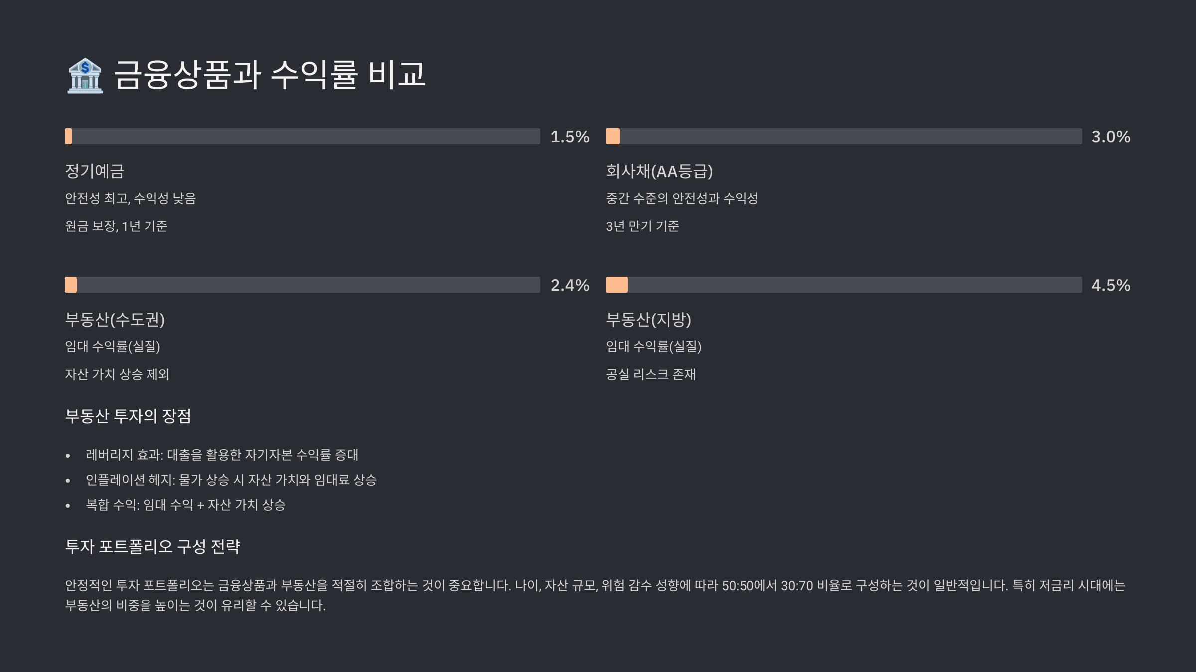이제 금융상품과 부동산의 수익률을 비교해보는 표를 보면서, 월세 수익의 현실적인 위치를 한눈에 파악해볼게요. 📌