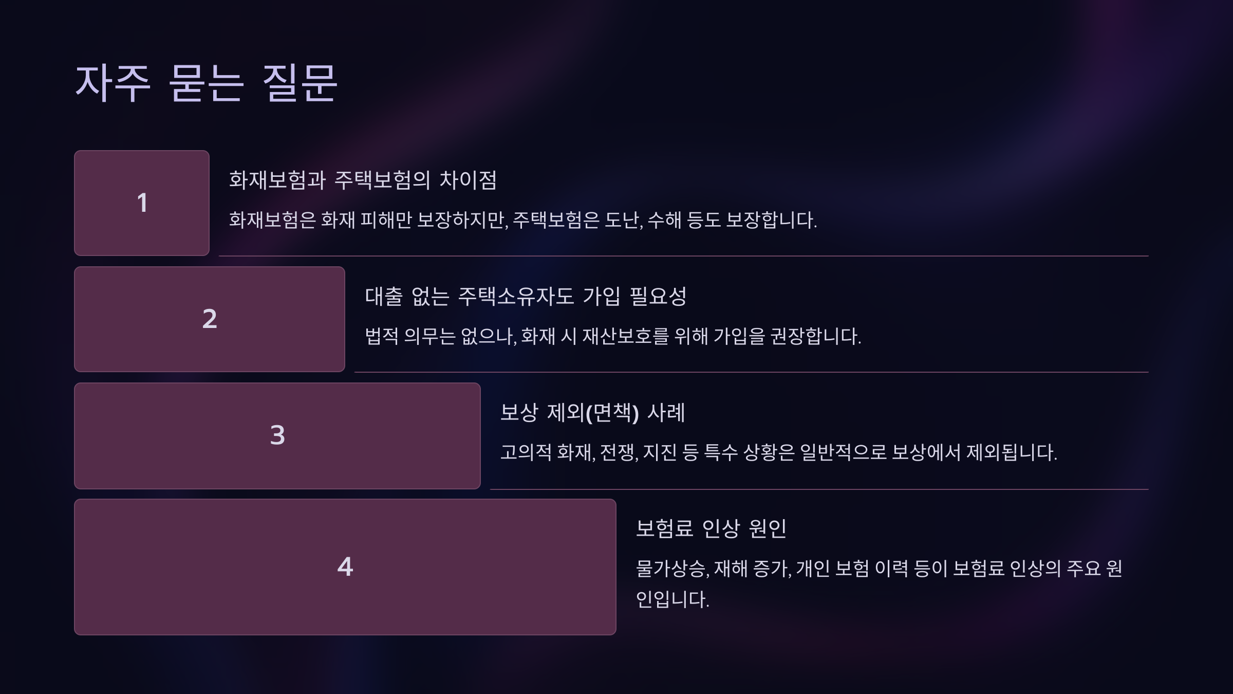 이처럼 다양한 실제 사례를 보면, 화재보험이 단순히 ‘불이 났을 때 보상해주는 수단’이 아니라는 걸 알 수 있어요. 집을 산 사람, 세입자, 반려동물 보호자, 1인 가구 모두에게 꼭 필요한 안전장치예요.