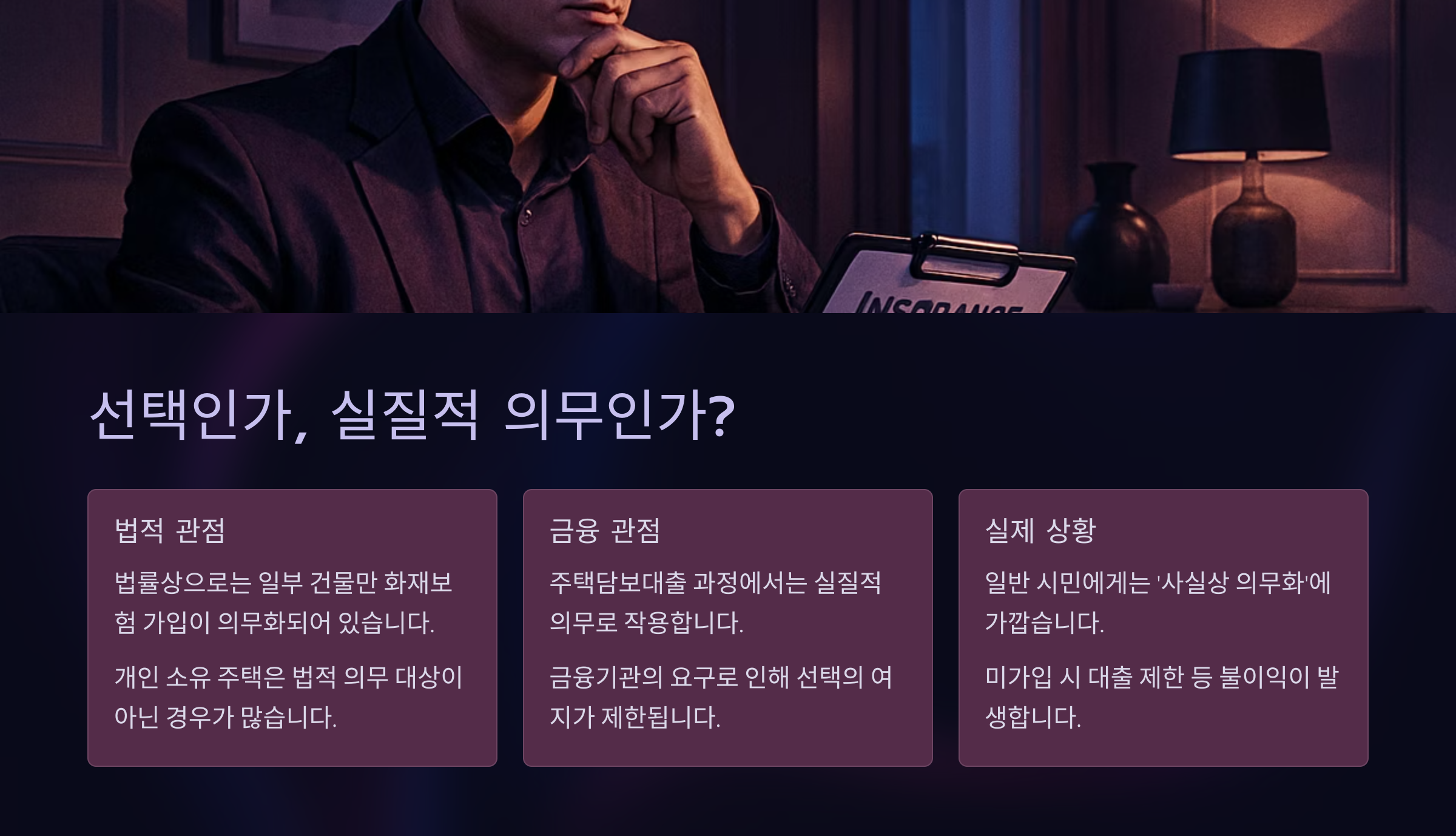 결국, 법이 강제하지 않더라도 상황과 조건에 따라 화재보험은 ‘권고가 아닌 필수’처럼 느껴지는 거죠. 안전과 재산 보호라는 측면에서, 법보다 현실이 더 크게 작용하고 있는 셈이에요. 🔍