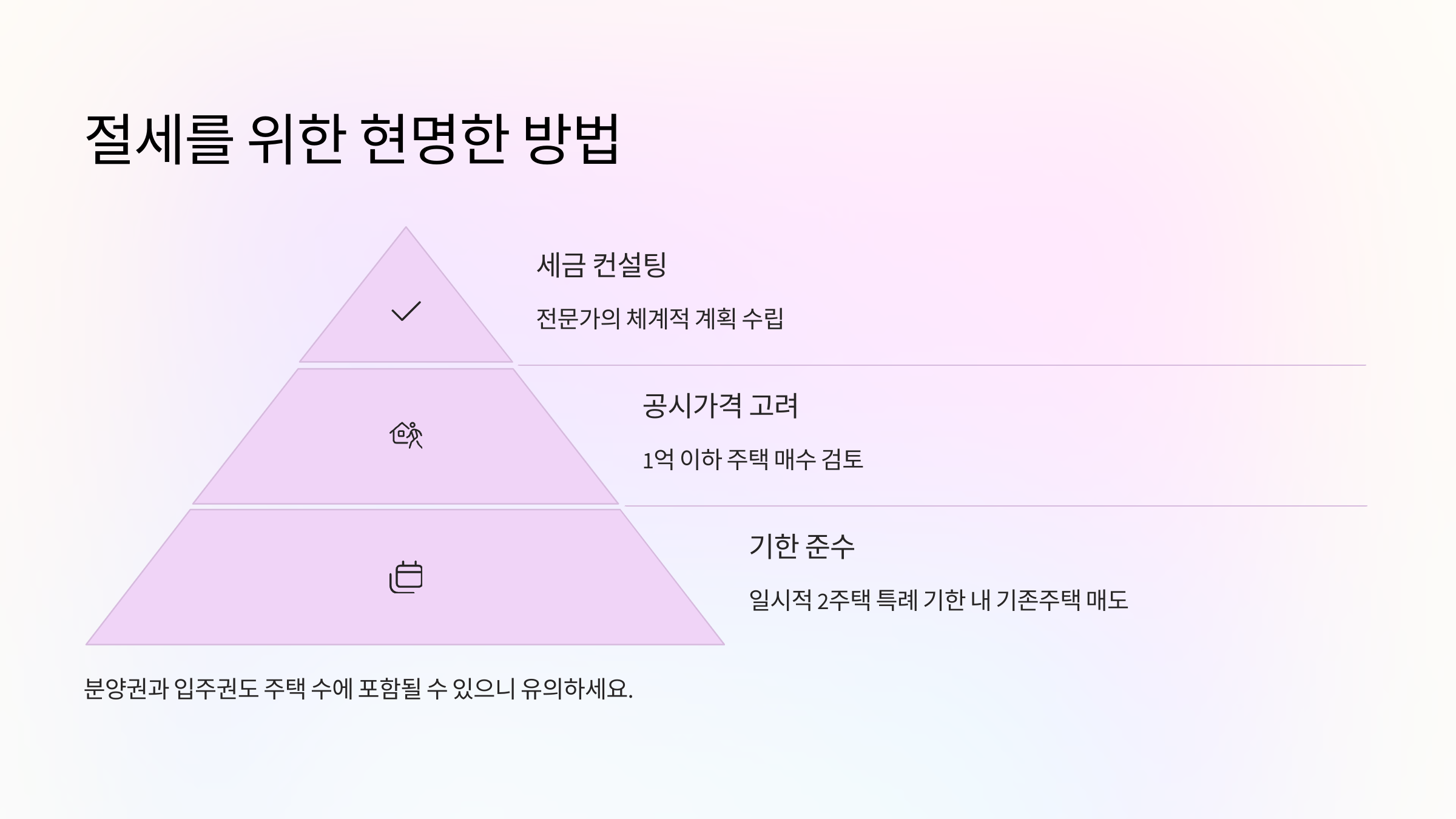 | 명의 분산 | 배우자·자녀 명의로 취득 (증여세 주의) |