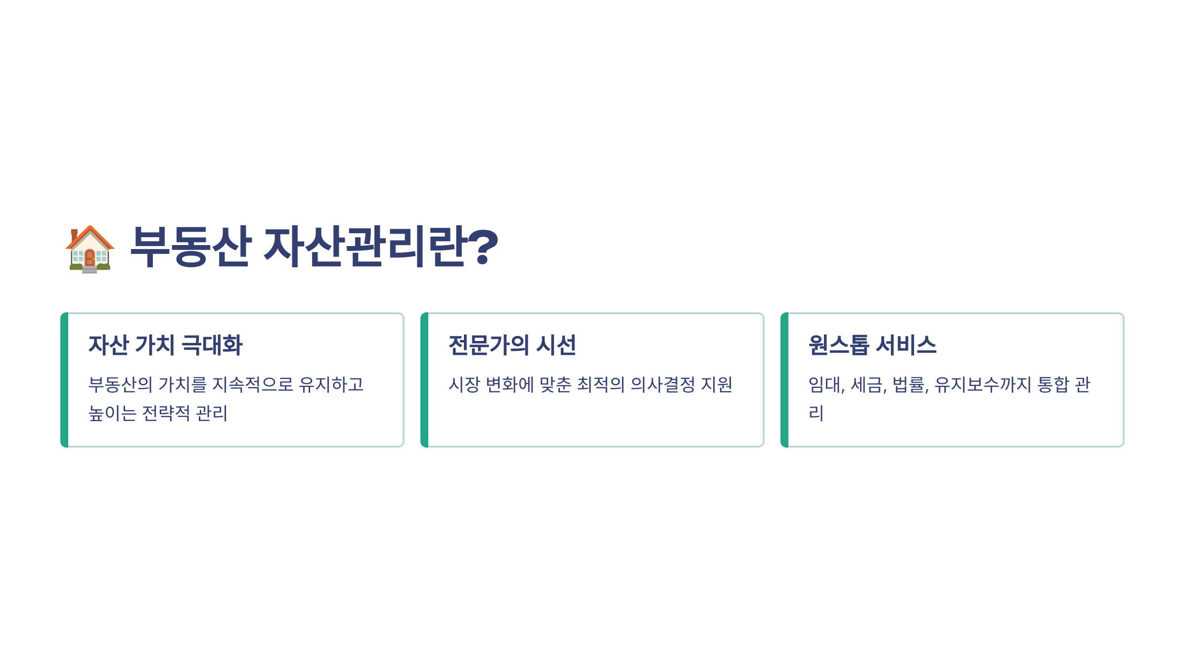 이 글은 일반적인 정보 제공을 목적으로 작성된 콘텐츠로, 특정 자산관리 계약에 대한 법적·세무적 책임을 대행하지 않습니다. 계약 체결 전 반드시 전문 상담을 받으시길 권장드려요. 부동산 자산관리의 결과는 자산 유형, 지역, 전략에 따라 달라질 수 있습니다.