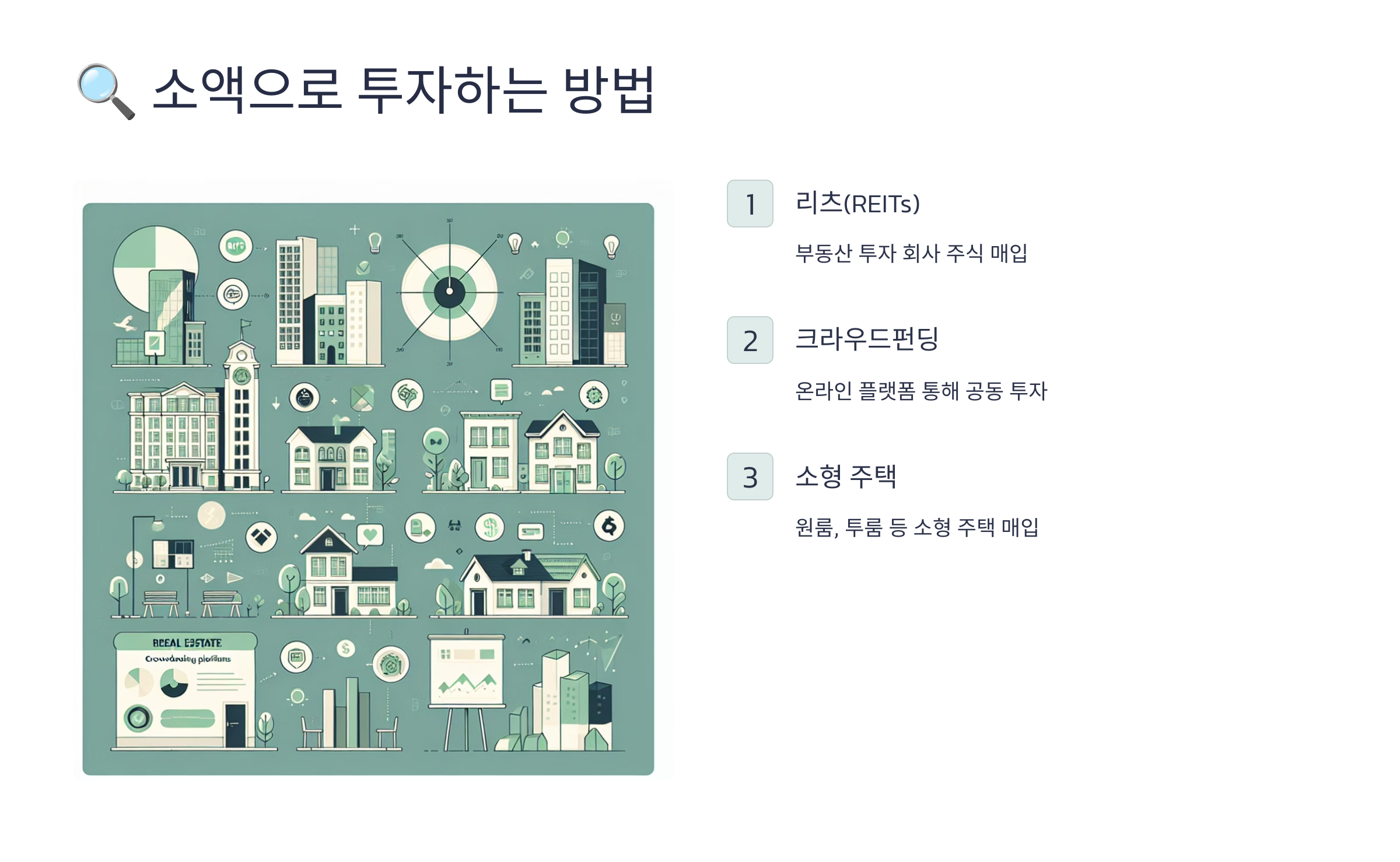 부동산 소액투자는 큰돈 없이도 부동산에 참여할 수 있도록 만들어진 투자 방식이에요. 일반적으로 수억 원이 필요한 기존의 부동산 매입 방식과 달리, 수십만 원부터 투자 가능한 것이 큰 특징이죠.