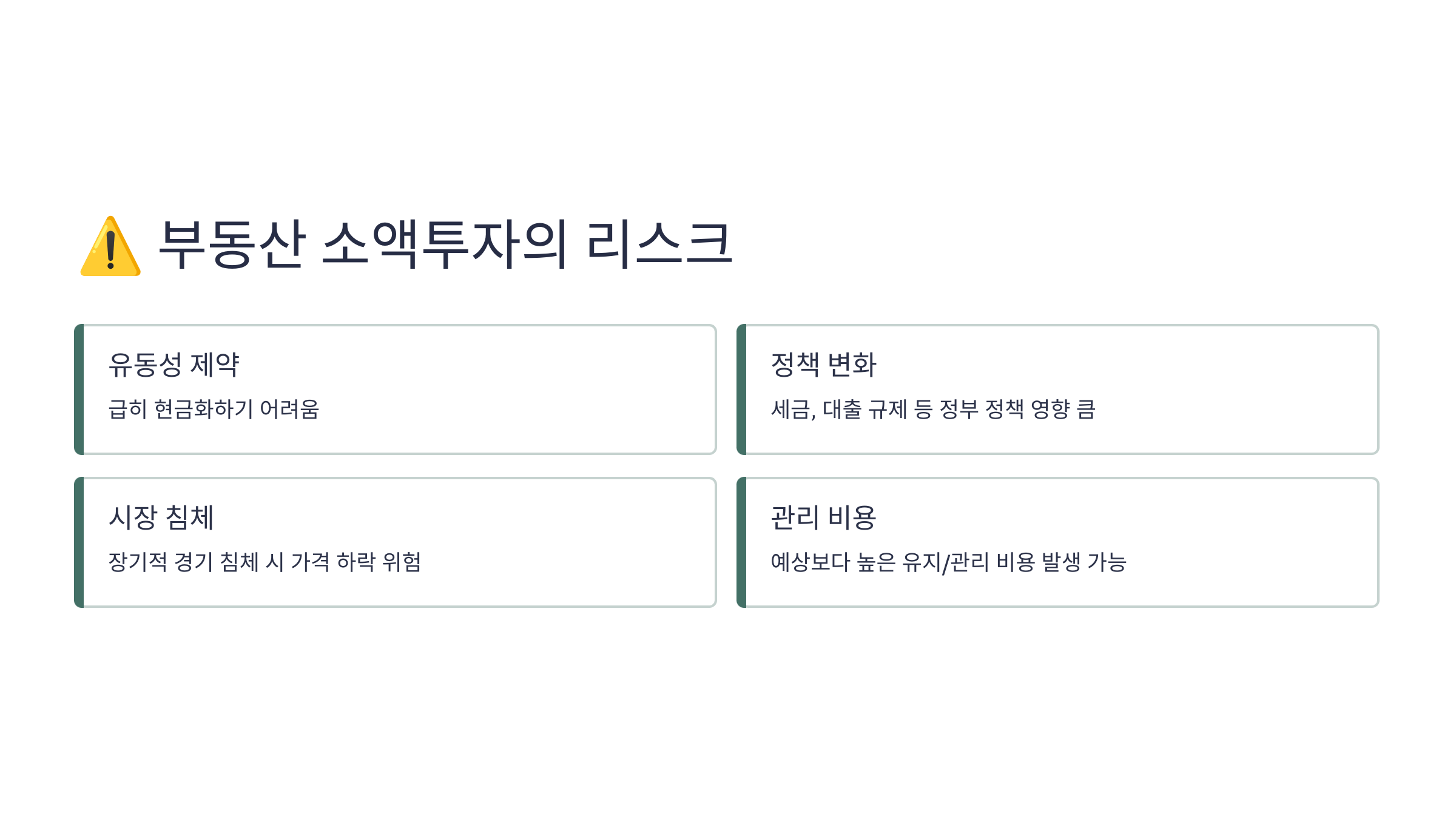 부동산 소액투자는 진입장벽이 낮고 수익성이 꽤 높지만, 그만큼 주의해야 할 리스크도 존재해요. 투자 전에 반드시 알고 있어야 할 주요 위험 요소들을 정리해볼게요.