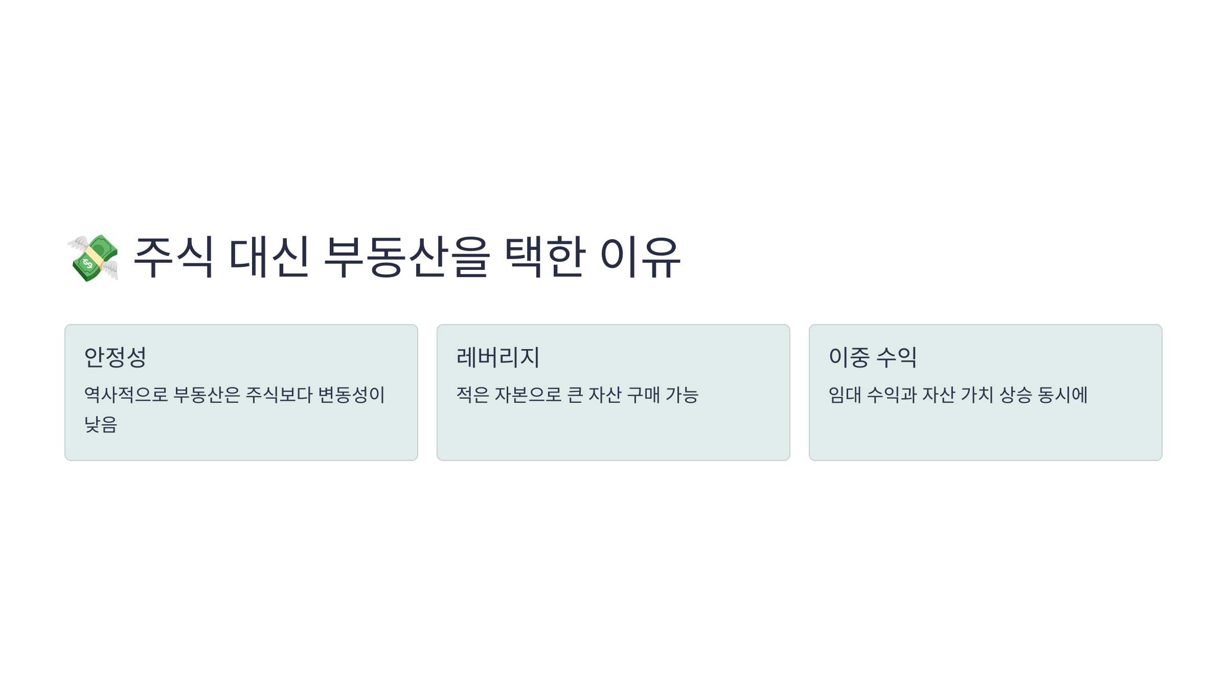 또한 부동산은 실물 자산이기 때문에, 심리적인 안정감도 있어요. 내가 투자한 자산이 어디 있는지, 어떤 형태인지 눈으로 볼 수 있다는 점이 큰 장점이에요.
