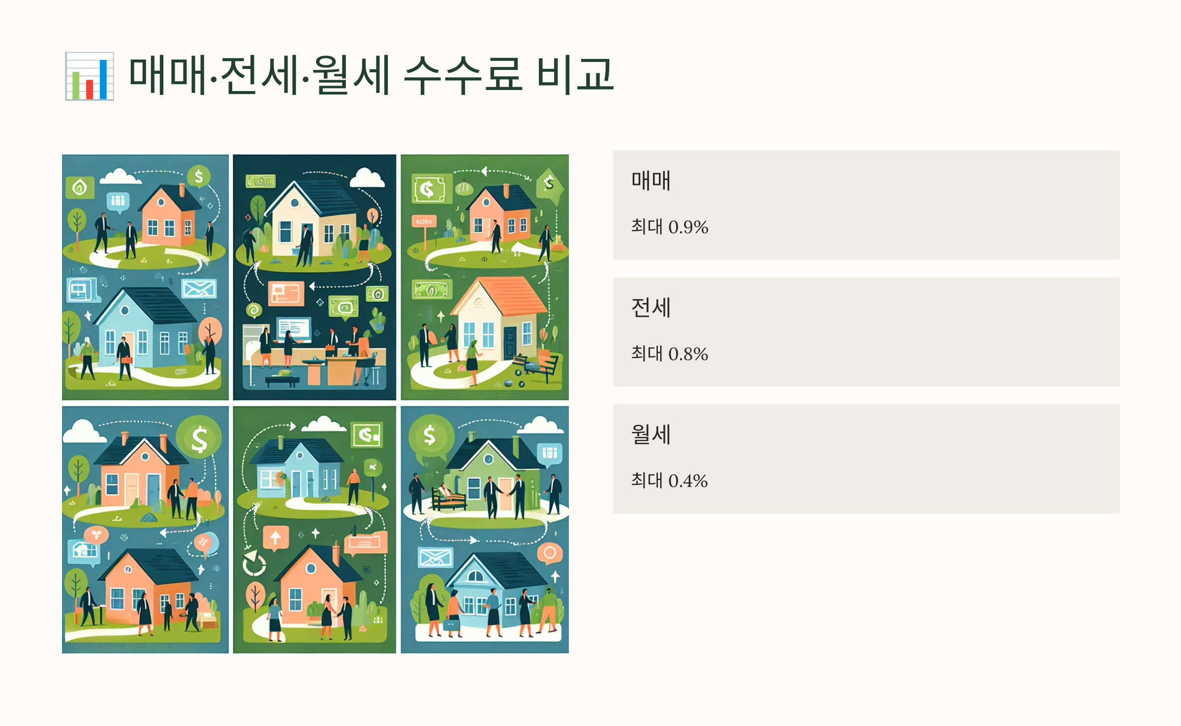 매매와 전세는 비교적 고가 거래가 많아 수수료 부담이 커질 수 있지만, 월세는 매월 납부하는 금액이 상대적으로 작아 부담이 적은 편이에요. 그래서 거래 유형에 따라 적절한 예산 계획이 필요하답니다.