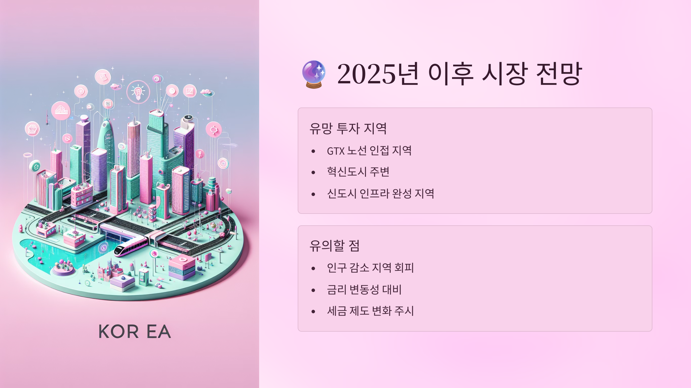 결국 2025년 이후의 시장은 **선택과 집중**이 중요해요. 모든 지역이 다 오를 수는 없고, 실수요 + 인프라 + 정책 수혜가 함께 작용하는 핵심지 중심으로 쏠림 현상이 더 심화될 거예요.