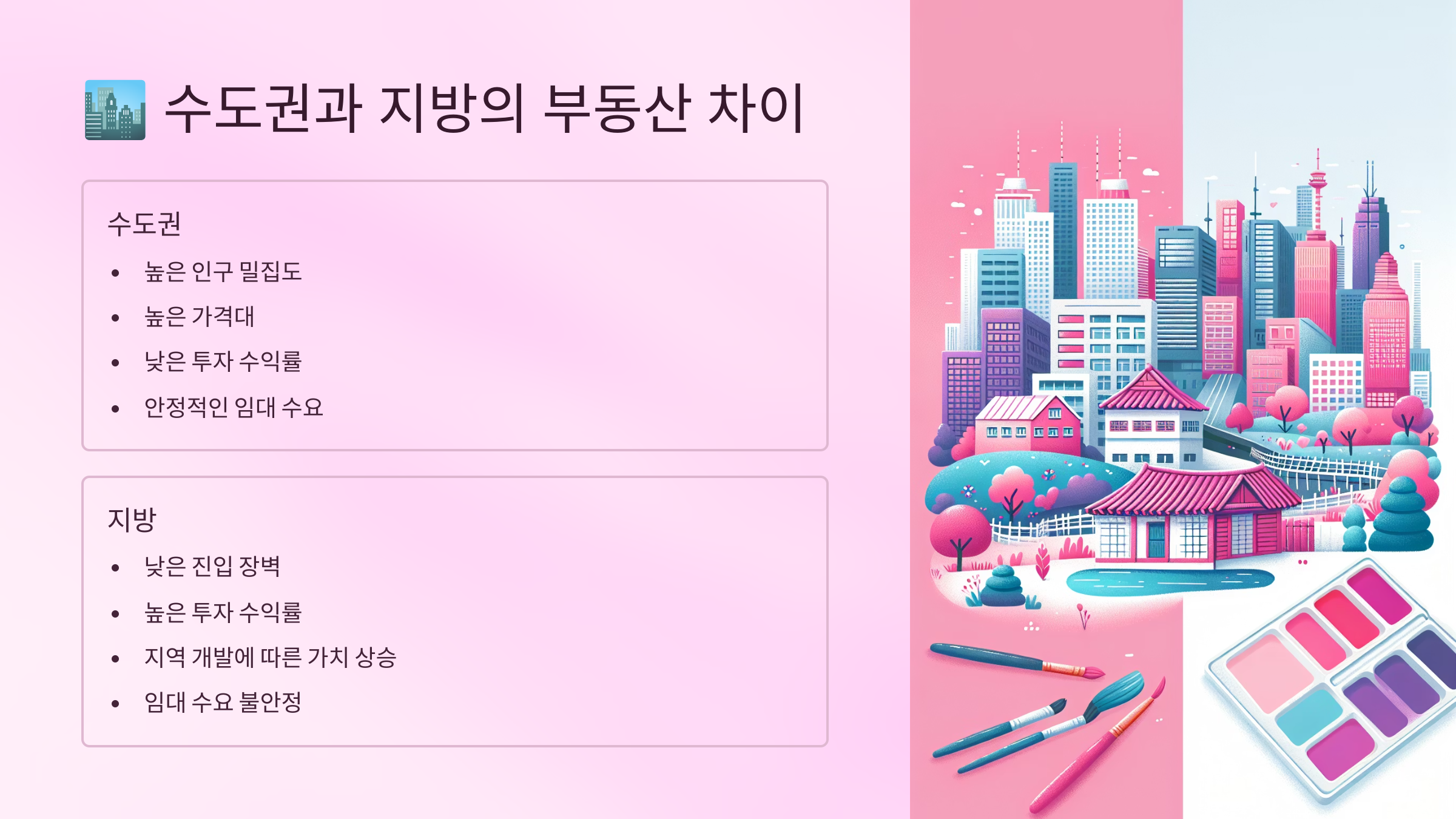 수도권은 장기적으로 상승 여력을 갖고 있지만, 무조건 다 오른다는 착각은 위험해요. 지방도 일부 핵심지역은 저평가 매수 기회가 있을 수 있죠. 그래서 지역에 따라 전략을 세분화해서 접근하는 게 중요해요.