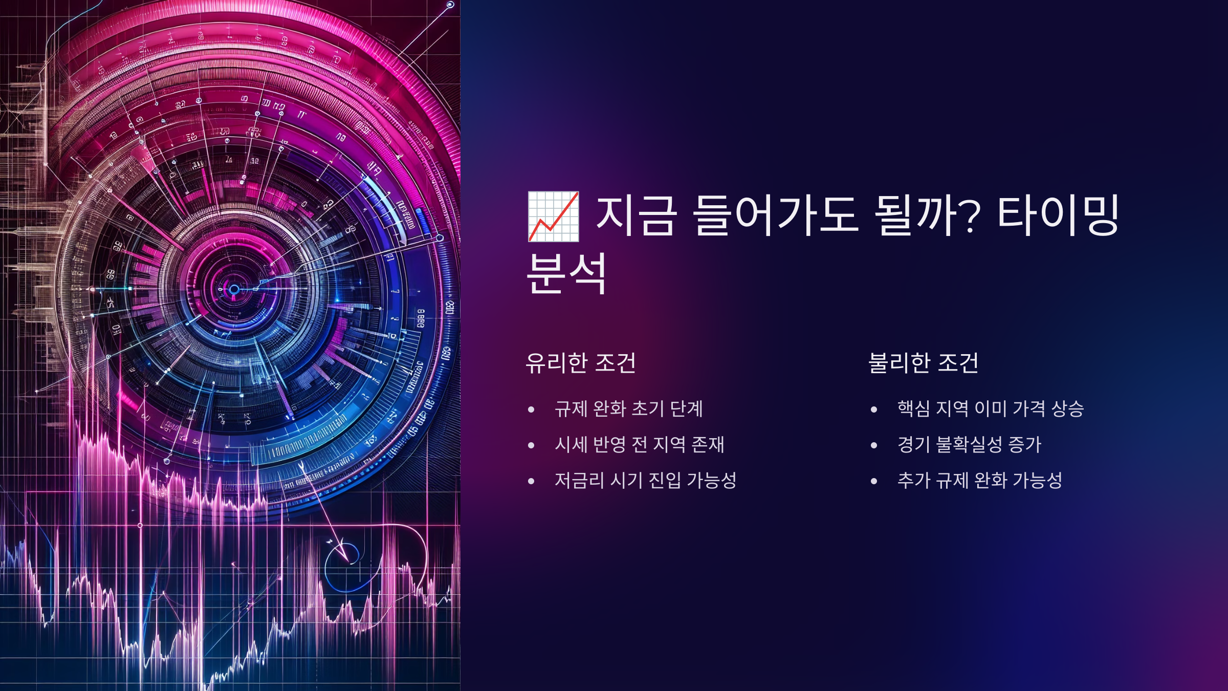 두 번째는 **추가 규제 또는 정책 변경**이에요. 부동산 정책은 정부 성향에 따라 바뀔 수 있어요. 예를 들어, 정권이 바뀌거나 총선/대선 이후 정치적 방향이 달라질 경우, 다시 규제가 강화될 가능성도 무시할 수 없어요. 이미 수차례 반복되었죠.